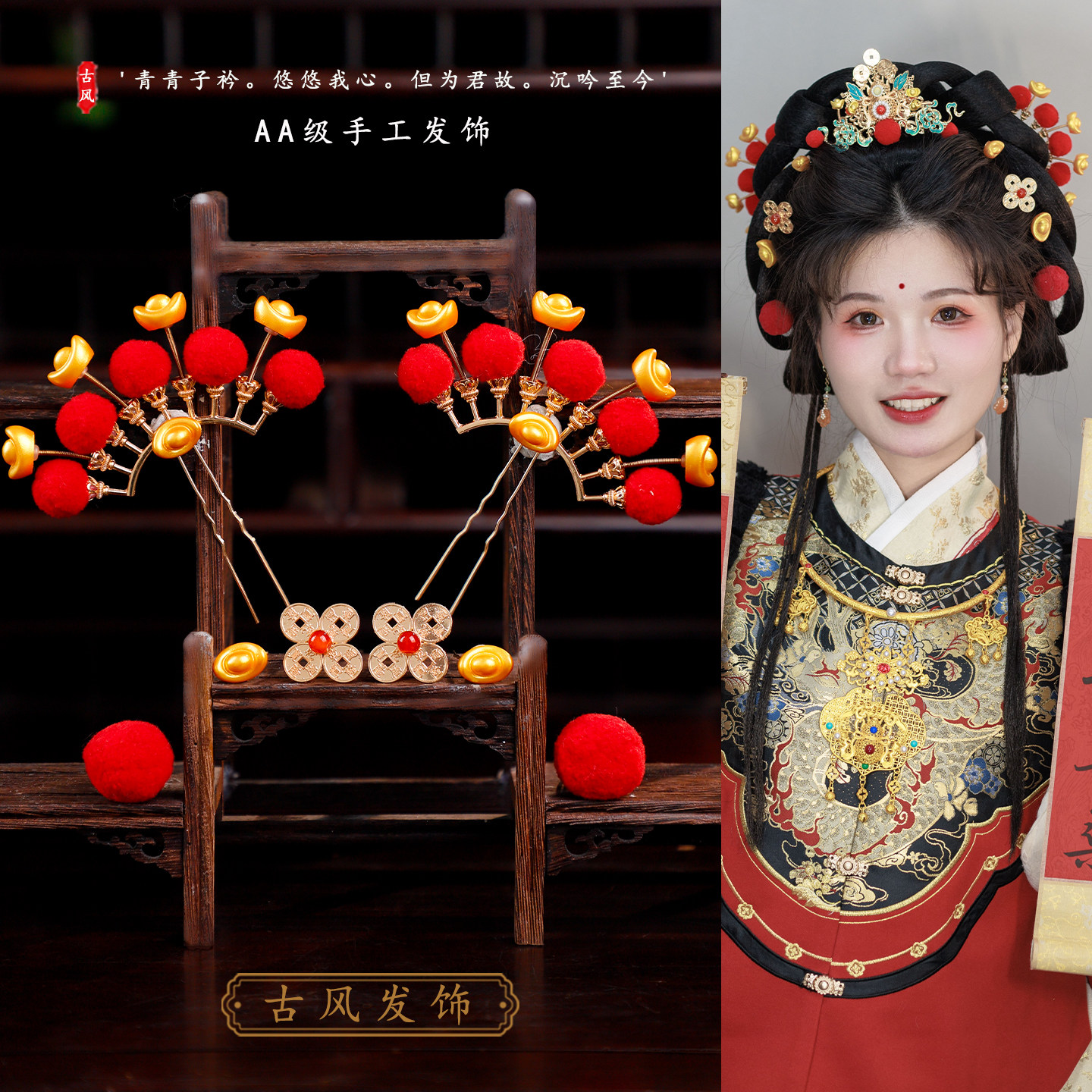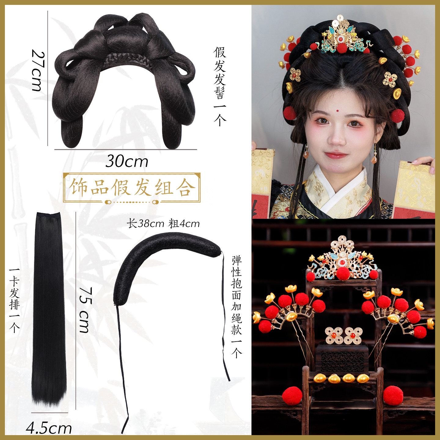 淘宝新年喜庆可爱少女造型假发头饰套装搭配古风汉服发髻抱面发排组合