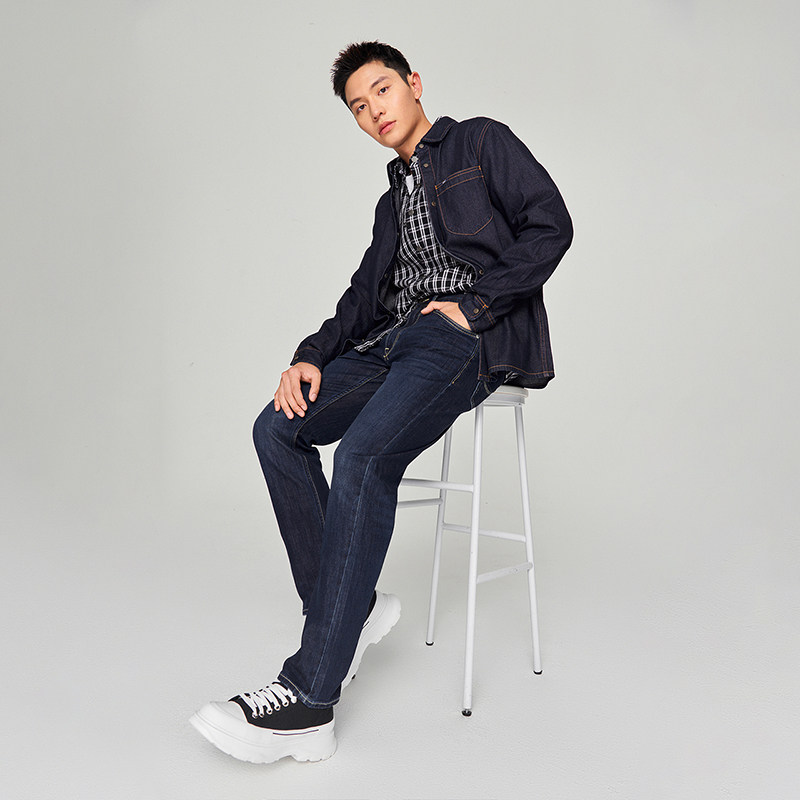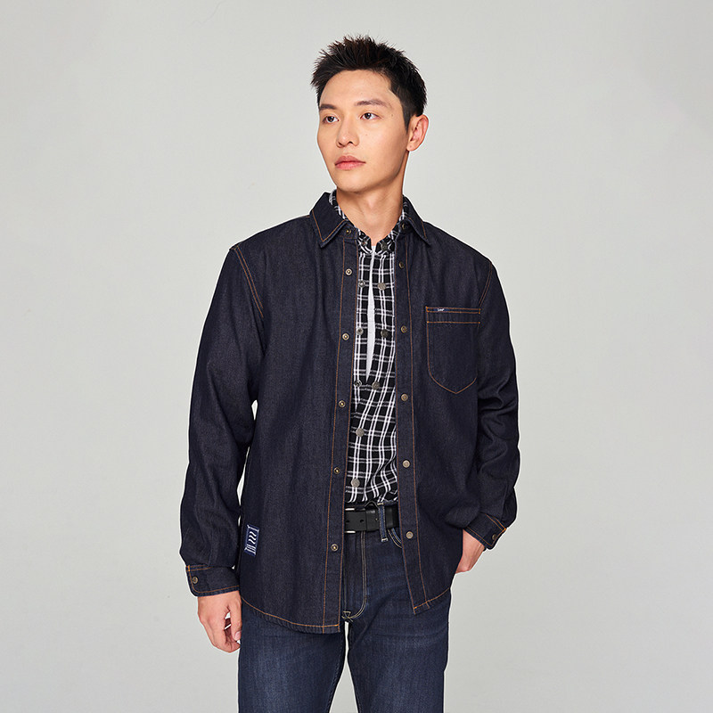 天设计师款佐丹奴牛仔衬衫男洗水单口袋宽松长袖牛仔衬衣男18045803