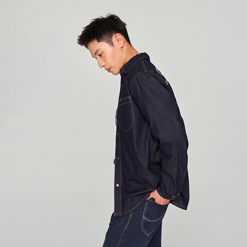 天猫Lee商场同款舒适版101+刺绣图案清水洗男长袖牛仔衬衫休闲潮流