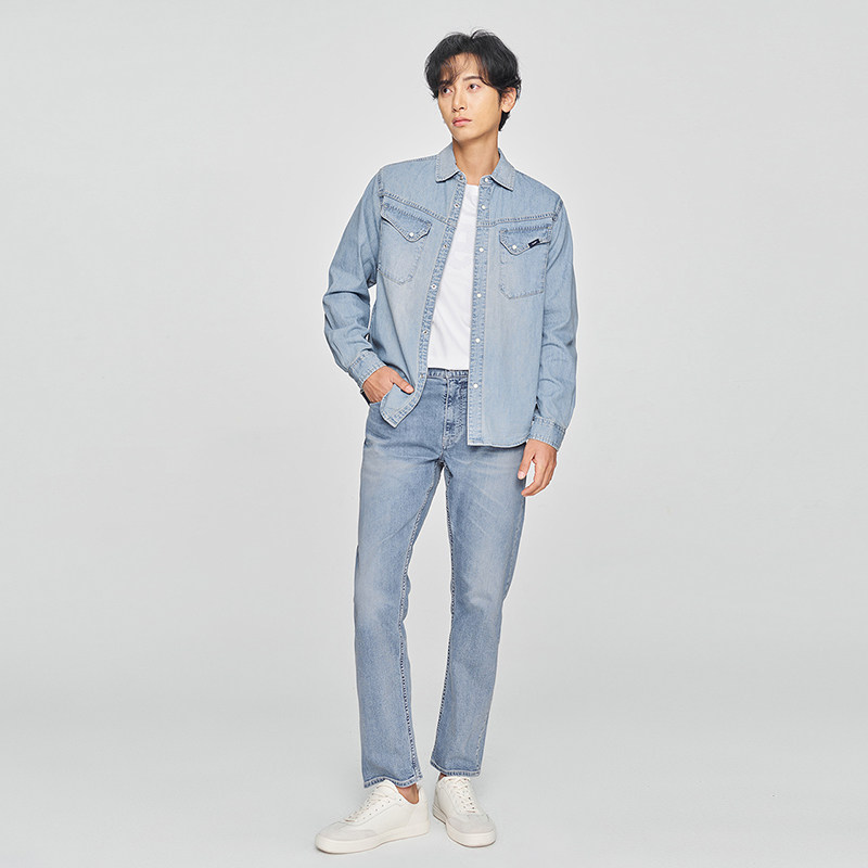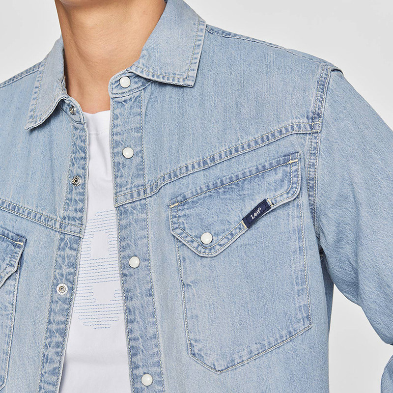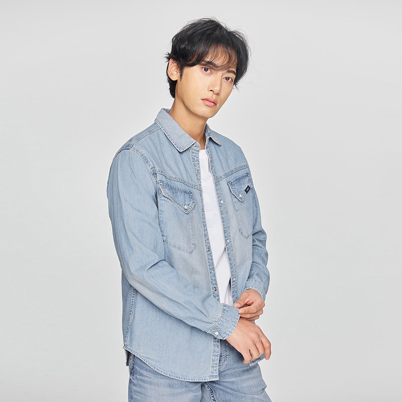 天猫Lee商场同款25新品舒适版翻领101+复古浅蓝色男长袖牛仔衬衫休闲
