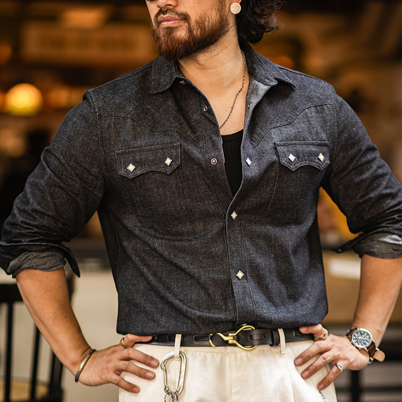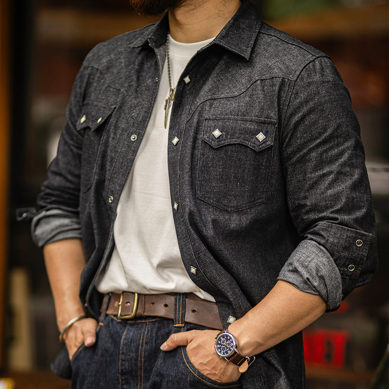 西部牛仔衬衫|TrigCo日本进口7oz水洗复古单宁宽松长袖上衣男秋