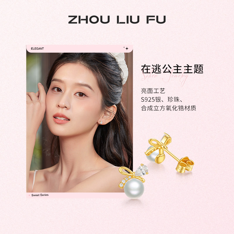 天猫周六福银饰S925银黄金色蝴蝶结耳钉淡水珍珠耳饰优雅新年礼物