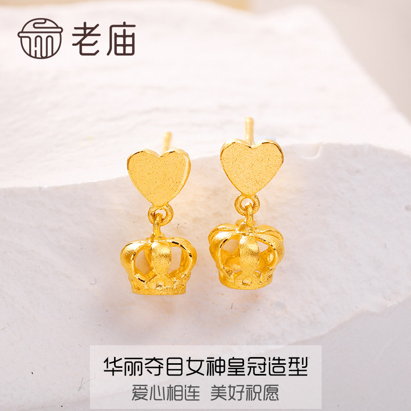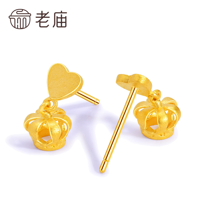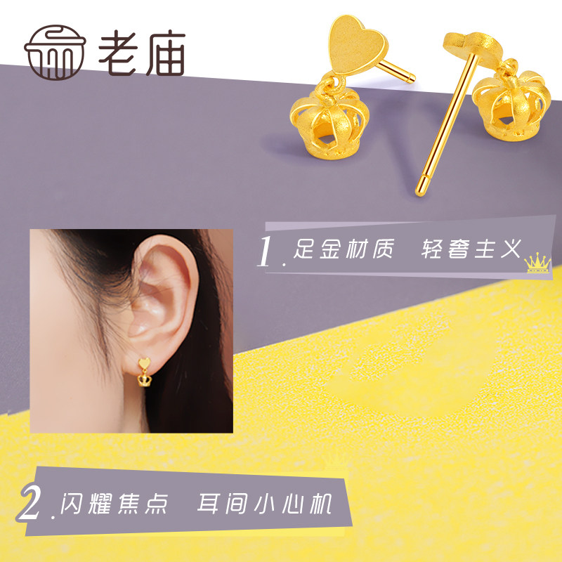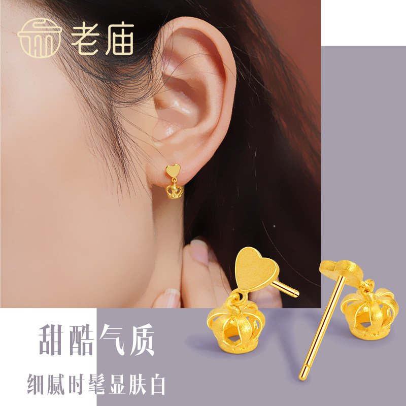 天猫老庙黄金足金999立体镂空金珠皇冠耳饰耳环耳钉情侣官方正品礼物