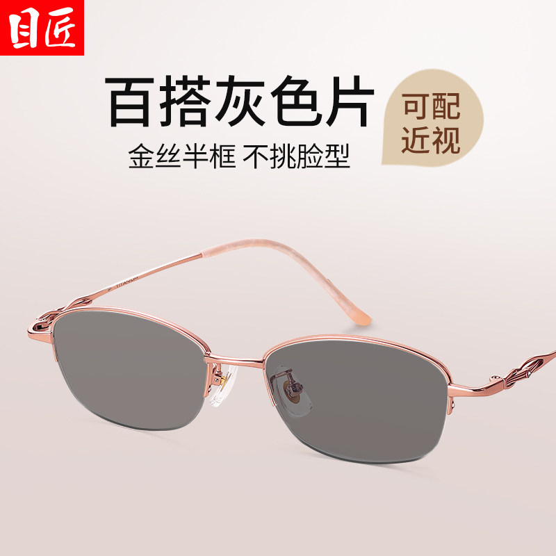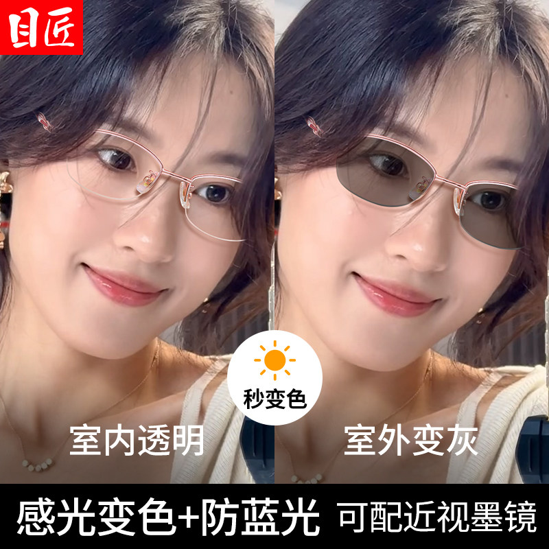 天猫自动感光变色近视眼镜女款可配度数墨镜防蓝光超轻纯钛半框太阳镜