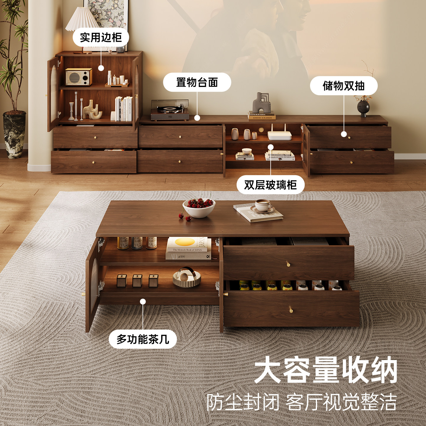 天猫实木组合电视柜家用茶几桦木边柜一体靠墙中古风客厅储物收纳柜