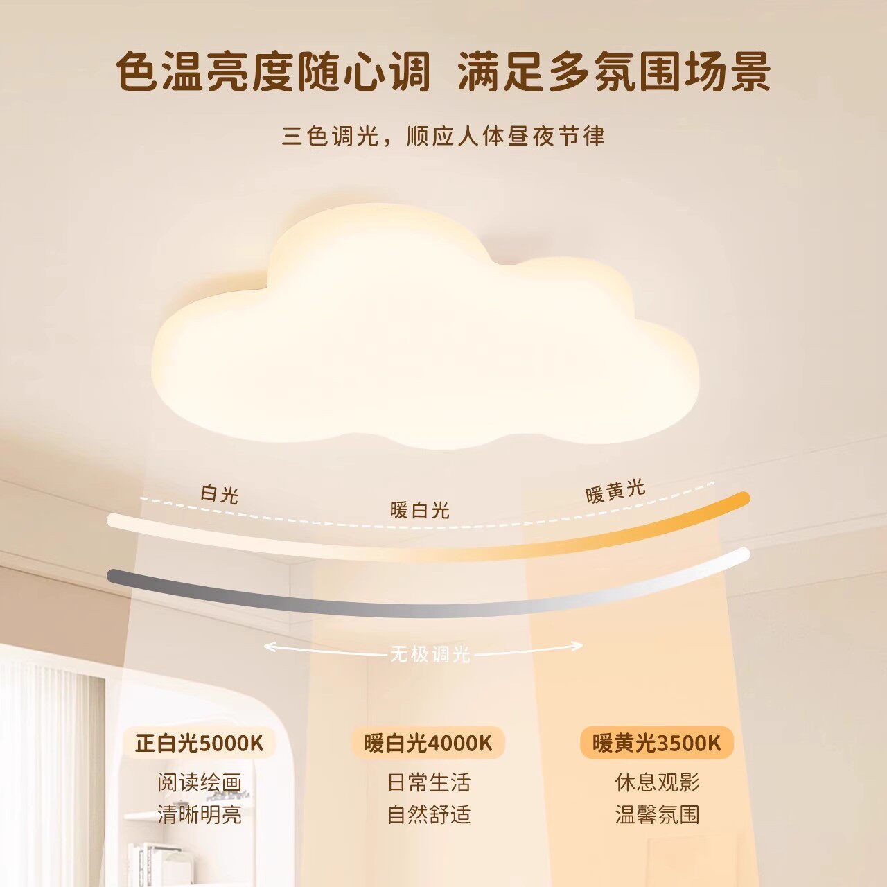 雷士照明全光谱吸顶灯专为儿童房与主卧室设计,采用仿生云朵造型,柔和圆润,营造温馨舒适的居家氛围。灯具搭载全光谱LED光源,高度还原自然光,有效缓解视觉疲劳,保护孩子视力健康。光线均匀柔和,无频闪、无蓝光危害,适合男孩女孩长期使用。智能调光调色功能,支持暖光、自然光、白光自由切换,满足不同场景需求。高显色指数(Ra≥95)让色彩更真实,提升空间质感。安装简便,适配多种装修风格,既是照明工具,也是房间装饰亮点,为家庭打造健康、安全、美观的照明环境。