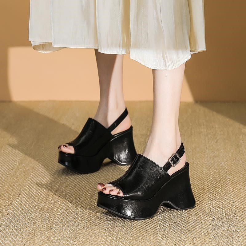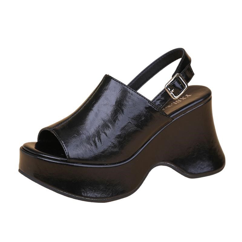 淘宝2025年夏季新款防水台松糕底厚底鱼嘴凉L鞋一字扣带黑色百搭高跟