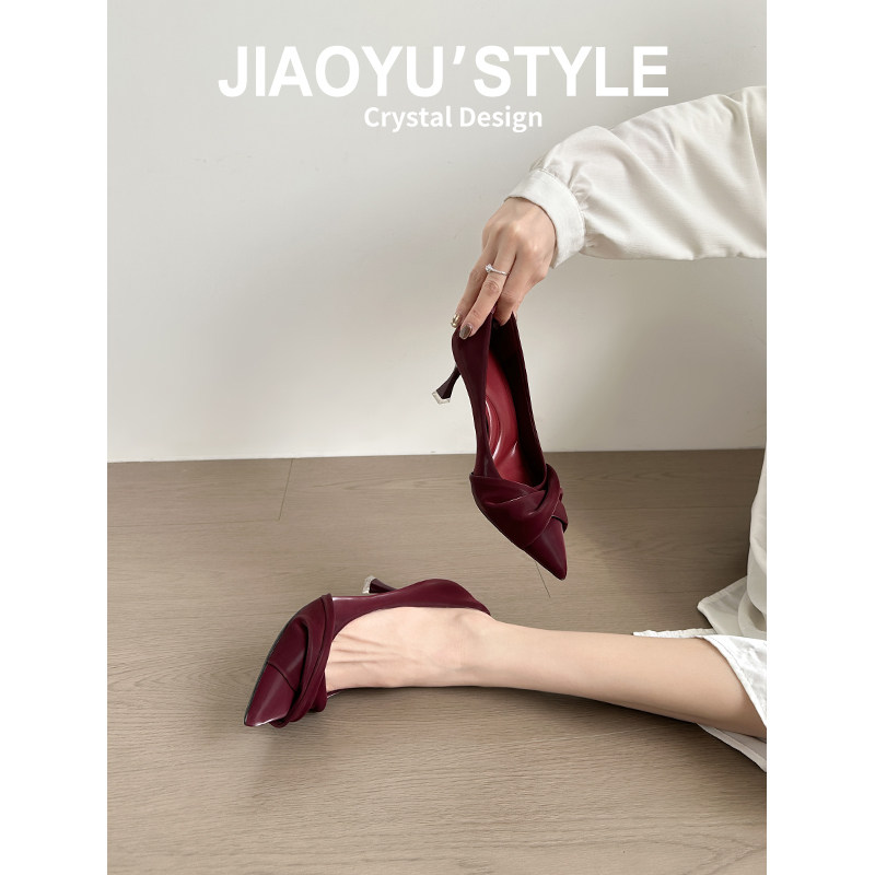淘宝真皮~骄屿红色高跟鞋尖头细跟秀禾新娘婚鞋绸缎浅口百搭粉色单鞋