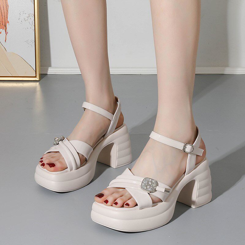 淘宝时尚防水台露趾高跟凉拖鞋2024夏季新米色粗跟方头一字带扣女鞋
