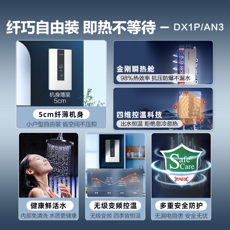 海尔出品统帅即热式电热水器DX1P,专为现代家庭设计,集高效节能与舒适沐浴于一体。采用变频恒温技术,精准调控水温,告别忽冷忽热,带来稳定舒适的洗浴体验。即开即热,无需等待,快速加热满足多人连续使用需求。小巧机身节省空间,适配多种卫生间布局。配备多重安全防护,包括防电墙、防干烧、防超温等,守护全家用水安全。智能触控面板操作简单,老人小孩也能轻松使用。统帅作为海尔旗下年轻时尚品牌,DX1P兼顾品质与性价比,是追求便捷舒适生活的理想之选,让每一次沐浴都成为放松享受的时刻。