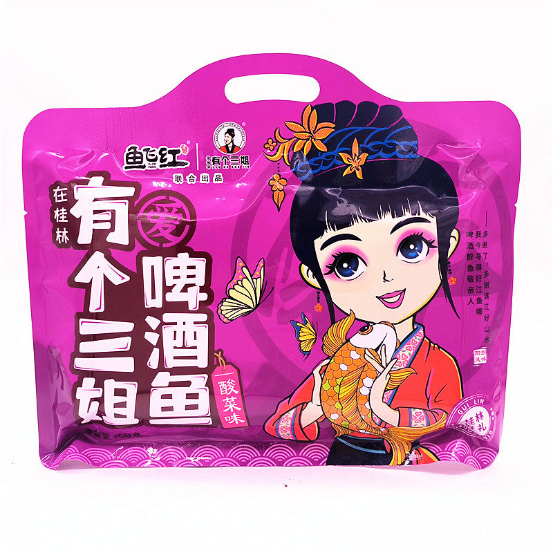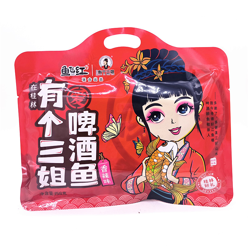淘宝桂林特产鱼飞红有个三姐158克原味啤酒鱼花生味酸菜味香辣啤酒鱼