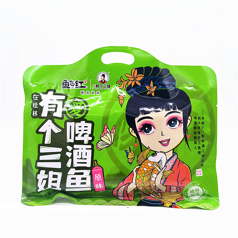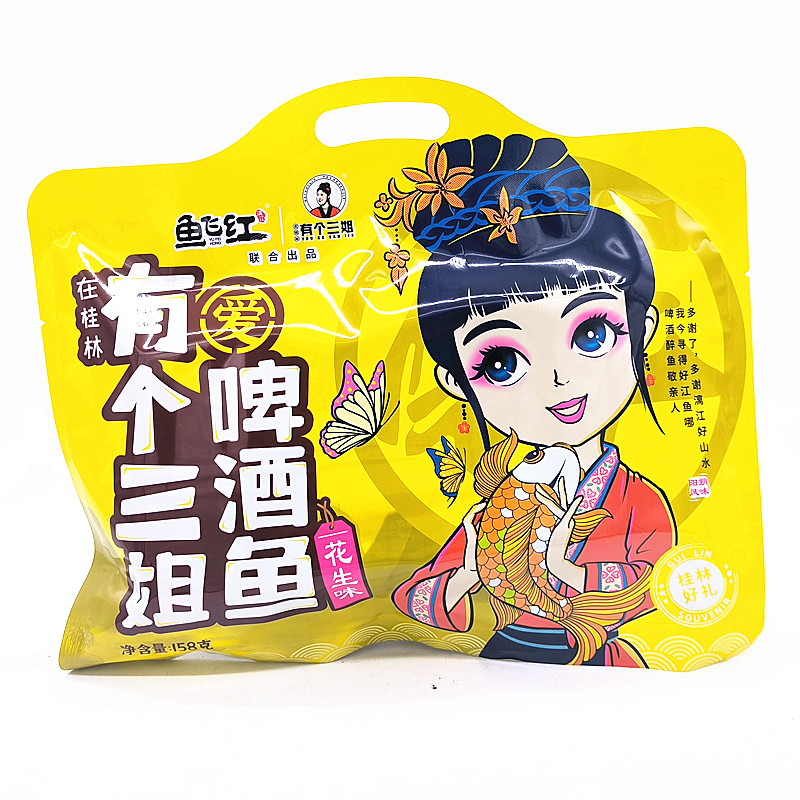 桂林特产“鱼飞红有个三姐”啤酒鱼系列,是一款融合当地风味与便捷食用的创新美食。精选优质鱼肉,搭配桂林特色啤酒慢炖入味,口感鲜嫩醇厚。产品推出158克小包装,方便携带与即食,现有原味、花生味、酸菜味和香辣四种口味,满足不同味蕾需求。原味突出鱼肉本香与啤酒醇香;花生味浓郁香滑;酸菜味清爽开胃;香辣味则劲道十足,层次丰富。每一口都承载着桂林山水间的地道风味,是馈赠亲友或旅途解馋的理想选择,让人在品尝中感受桂林饮食文化的独特魅力。
