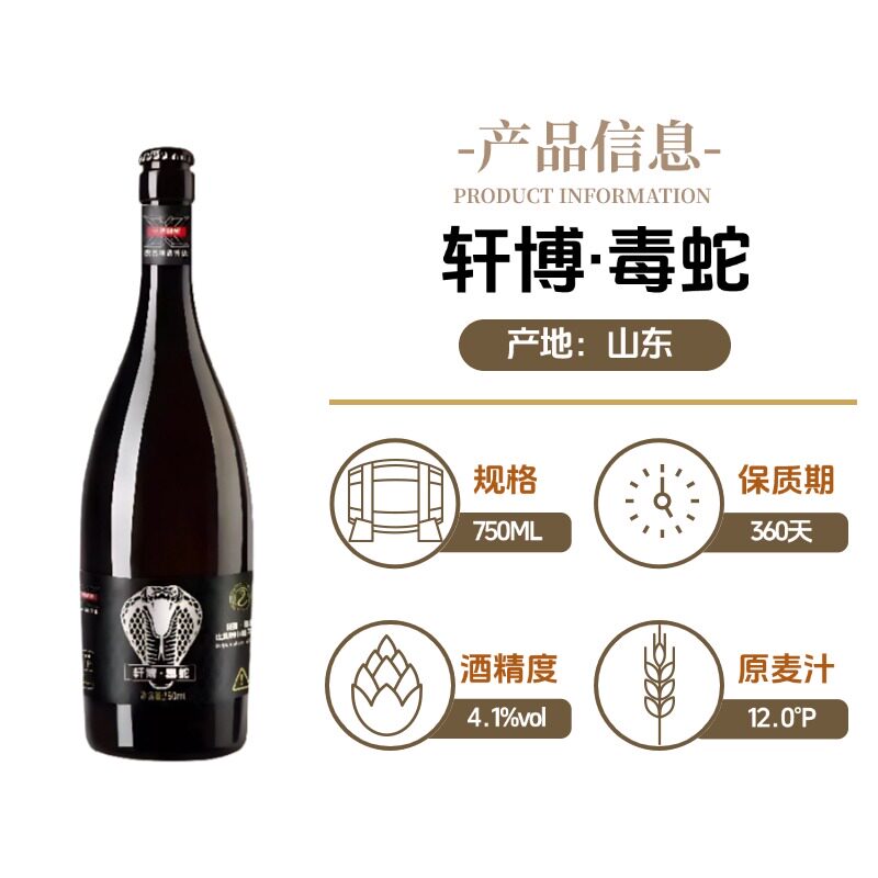 轩博毒蛇750ml瓶装国产精酿啤酒,是一款融合比利时风味的小麦白啤,酒体金黄透亮,泡沫细腻持久,散发着清新的柑橘与香料香气,口感顺滑微酸,麦香与果香交织,余味清爽宜人。采用优质麦芽、啤酒花及比利时酵母精心酿造,工艺考究,品质出众。750ml大容量瓶装设计大气精美,搭配精致礼盒包装,彰显品味与诚意。无论是作为节日赠礼、商务馈赠,还是朋友聚会分享,轩博毒蛇都是体现心意与格调的理想之选。国产精酿的匠心之作,让每一口都充满惊喜,送礼自用两相宜。