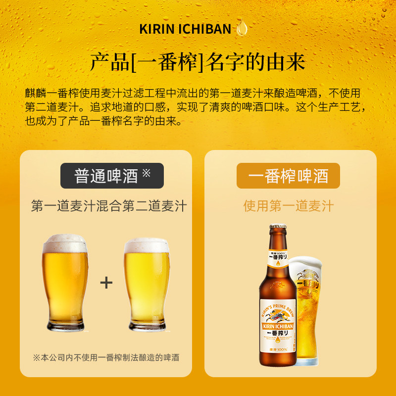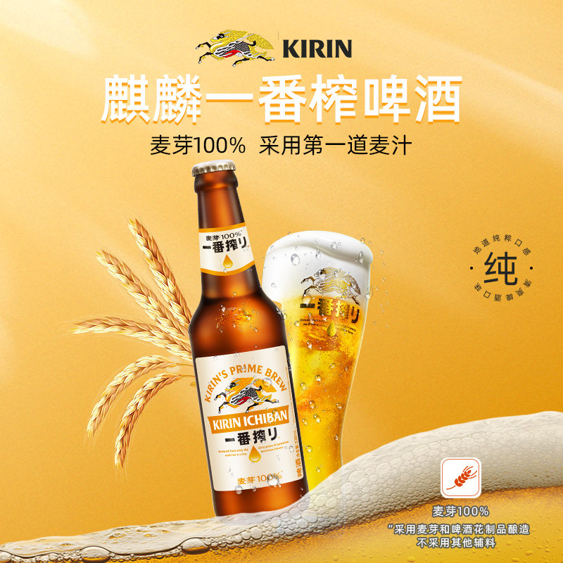 天猫KIRIN麒麟一番榨瓶装啤酒330ml*24瓶中浓度清爽麦芽啤酒