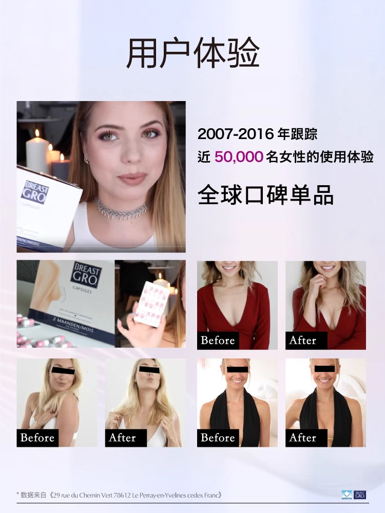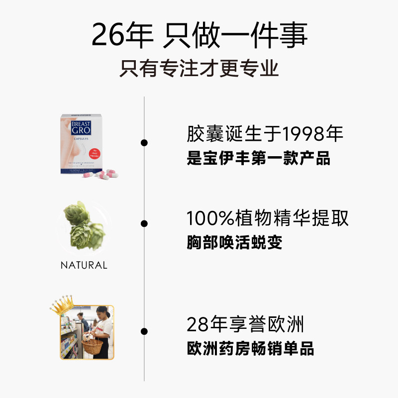 BREASTGRO宝伊丰护理胸部啤酒花胶囊是一款专为女性胸部健康设计的营养补充品,每盒含270粒胶囊,满足长期调理需求。产品精选天然啤酒花提取物,结合多种植物精华,科学配比,旨在促进胸部血液循环,改善胸部肌肤弹性,帮助维持健康紧致的胸型。其成分温和安全,适合成年女性日常保健使用。坚持服用有助于缓解胸部松弛、下垂等问题,提升自信与魅力。建议配合健康饮食与适度运动,效果更佳。请遵循说明书用量,孕妇及特殊体质者请咨询医生后使用。BREASTGRO宝伊丰,呵护女性之美,从胸部健康开始。