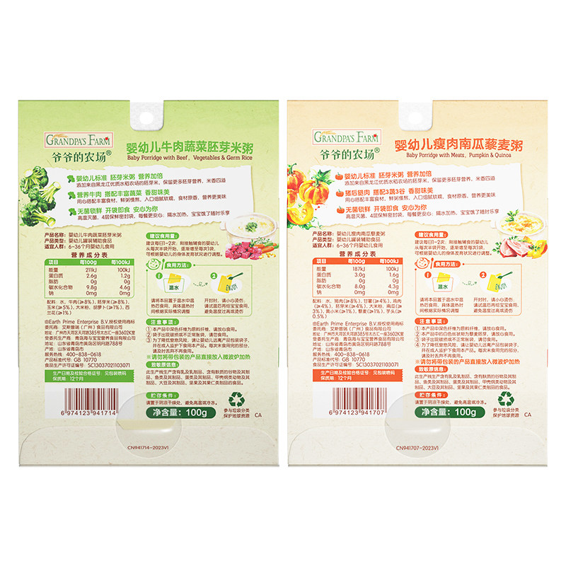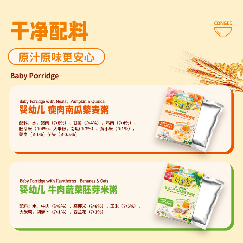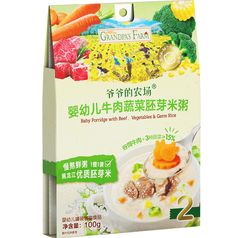 爷爷的农场儿童辅食——婴标宝宝营养粥,专为6月龄以上婴幼儿精心研制。精选优质牛肉与新鲜蔬菜,搭配嫩滑瘦肉与香甜南瓜,科学配比,营养均衡。每盒100g,共3盒装,方便携带与储存。产品严格遵循婴幼儿食品标准,无添加防腐剂、香精与盐,确保天然安全。质地细腻,易吞咽,助力宝宝肠胃消化吸收。富含蛋白质、维生素与膳食纤维,全面支持宝宝成长发育。爷爷的农场坚持有机种植与绿色生产,从源头守护宝宝健康。让宝宝在初尝辅食时,享受美味与营养的双重呵护,开启健康饮食第一步。