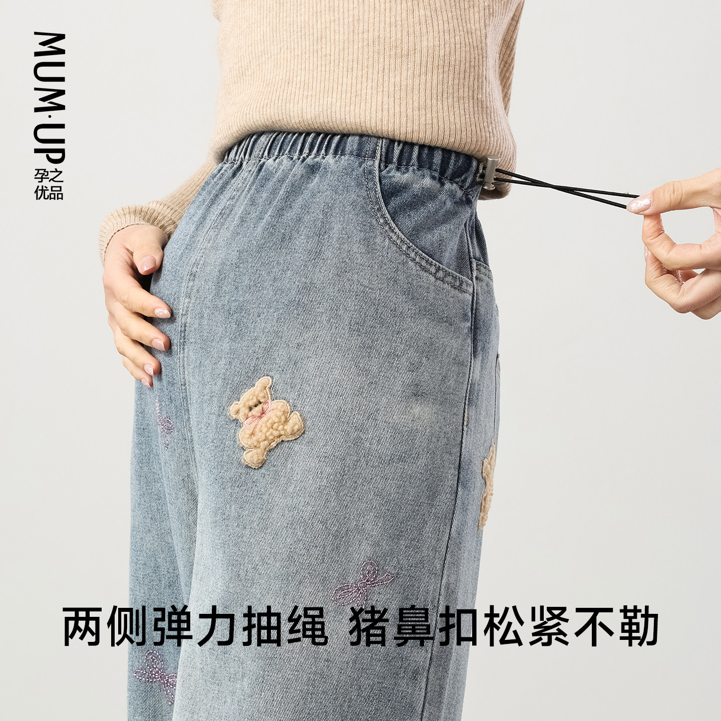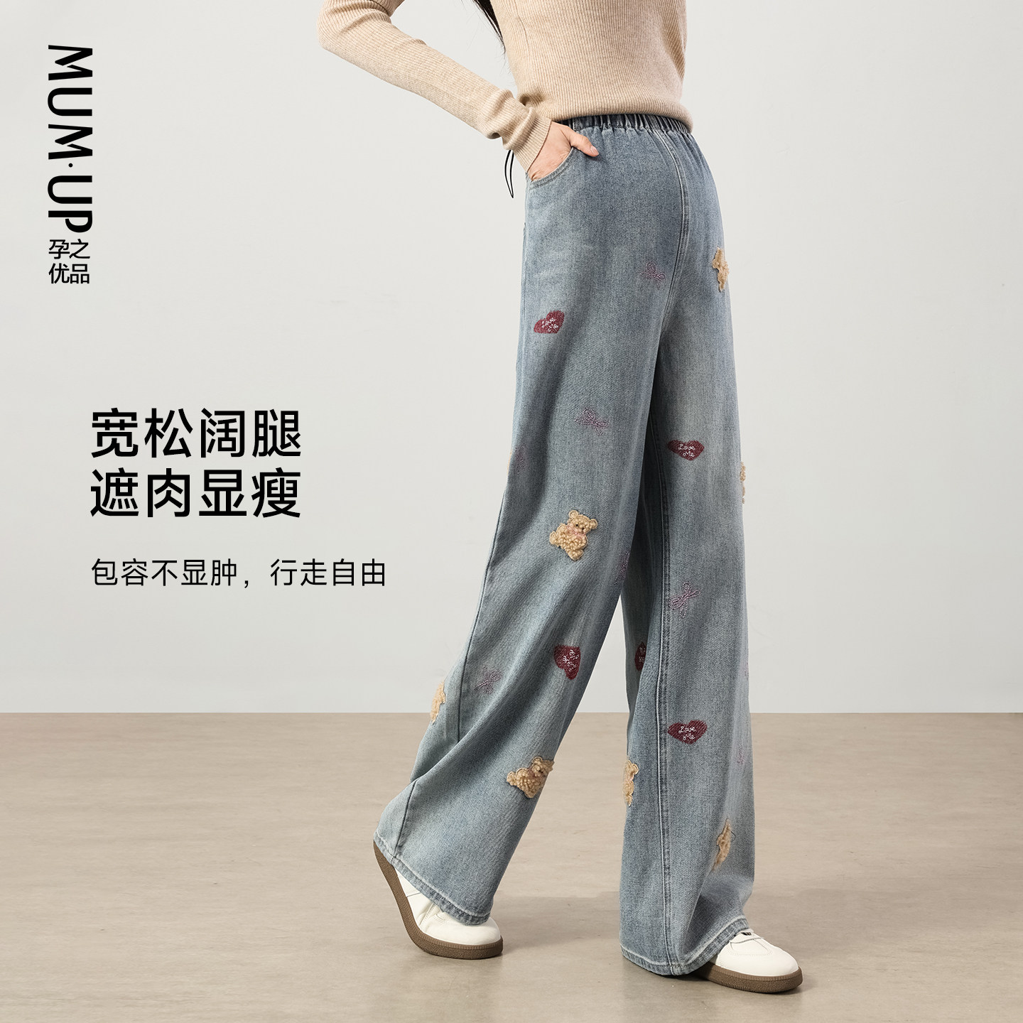 天猫【新品】孕妇牛仔裤春季新款小熊刺绣无托腹阔腿裤不勒肚子孕妇裤
