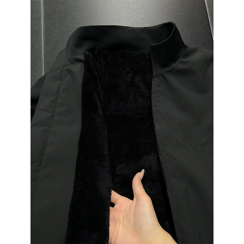 这款男士黑色立领加绒夹克棉服,专为冬季设计,融合实用保暖与时尚感。采用加厚夹棉填充,内衬细腻加绒,有效锁温,抵御严寒。立领设计简约利落,防风保暖,凸显干练气质。棒球服版型结合立体剪裁,穿着挺括有型,兼顾活动自由度。前襟拉链与按扣双重闭合,细节考究,提升整体质感。袖口与下摆罗纹收口,贴合身形,防止冷风灌入。整体以经典黑色为主调,百搭耐看,适合日常通勤、休闲出行等多种场合。兼具保暖性、舒适性与设计感,是冬季衣橱不可或缺的实用外套。