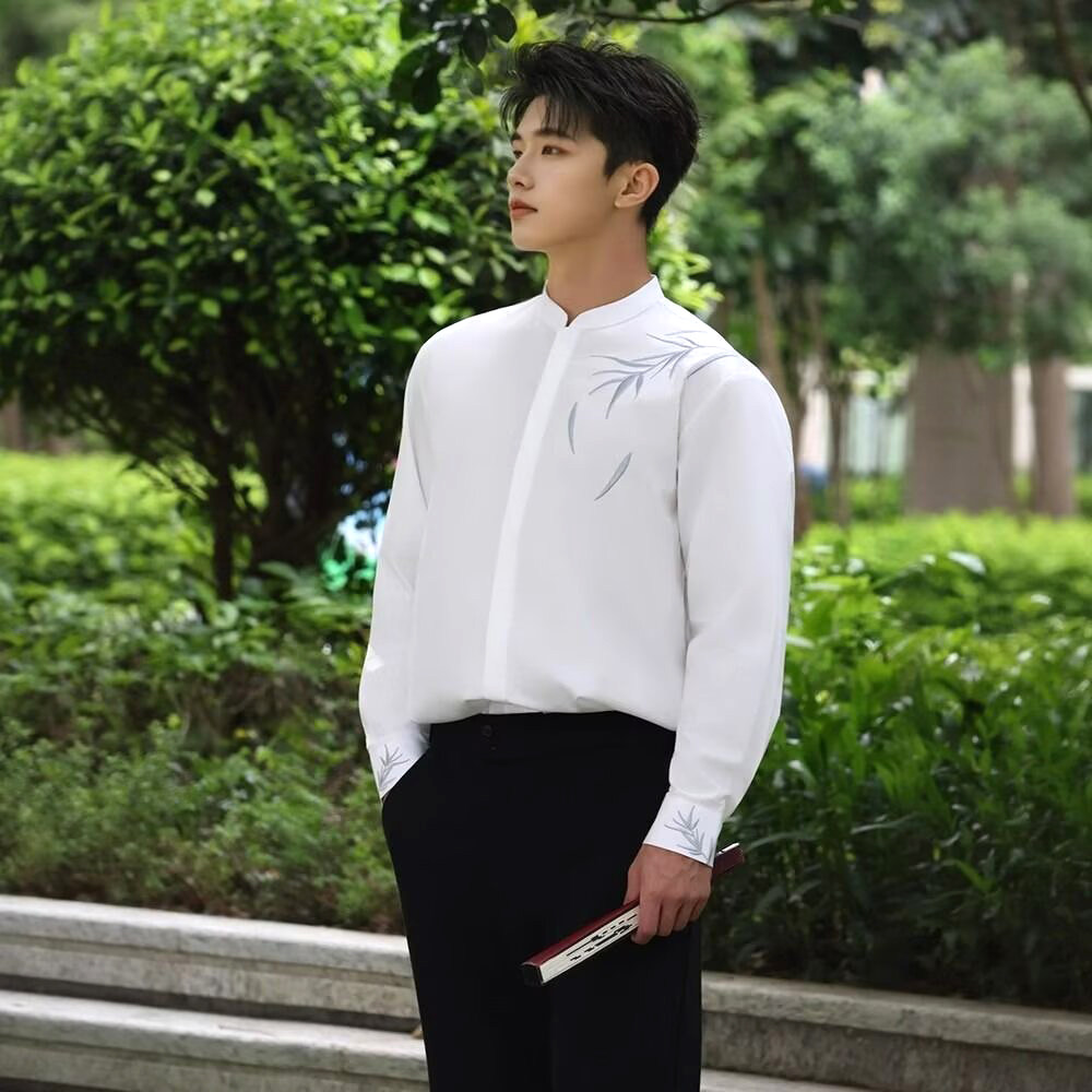 淘宝明星同款春秋立领刺绣白色长袖衬衣中国风内搭打底衬衫修身上衣男
