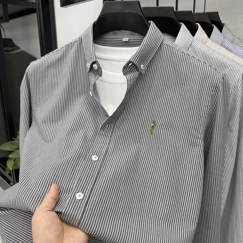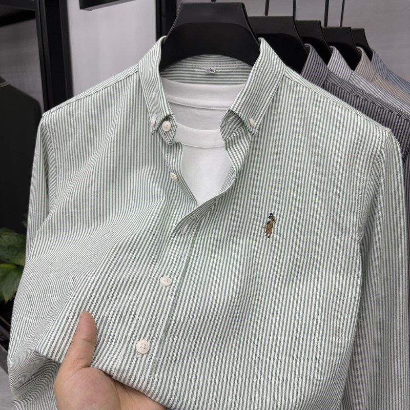 保罗100%纯棉男士条纹长袖衬衫中青年休闲全棉牛津纺大码衬衣男装