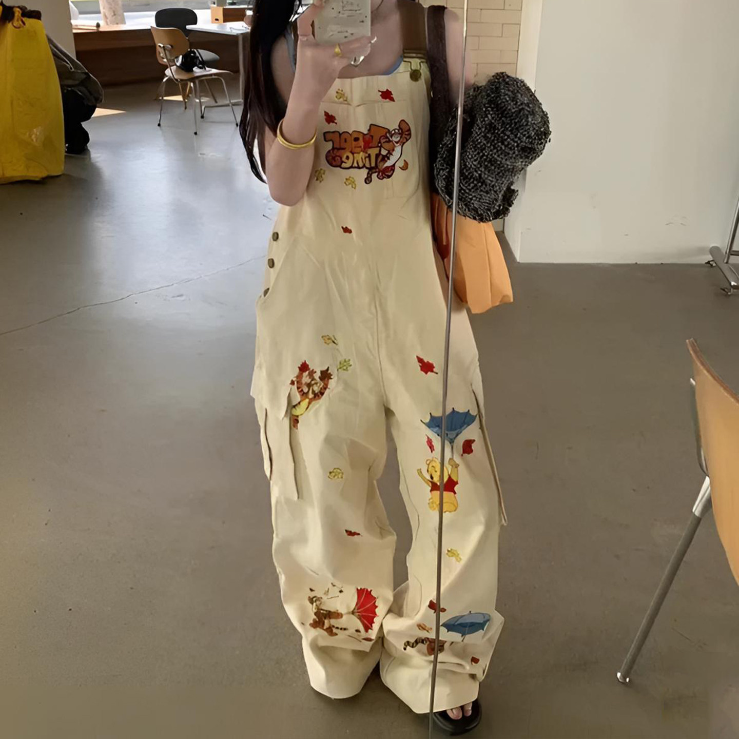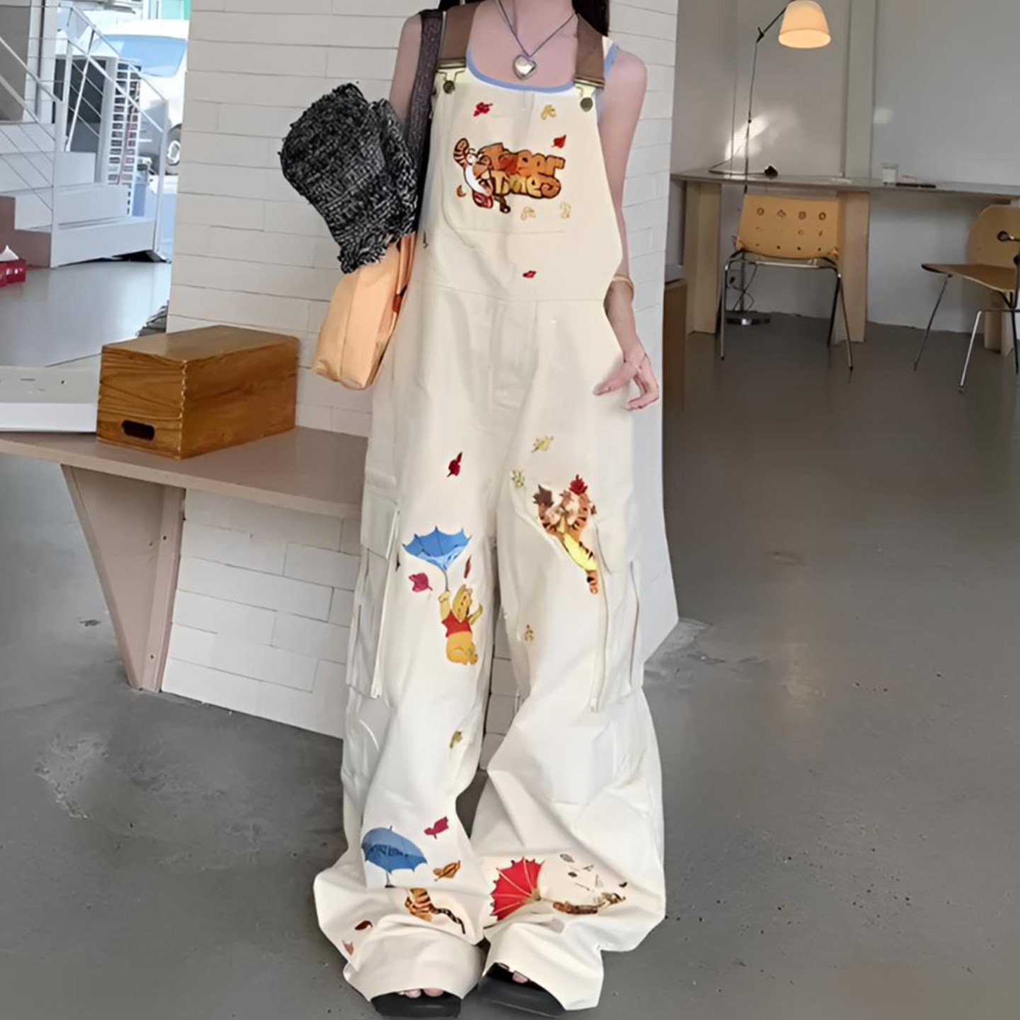 淘宝大码美式甜酷风卡通刺绣阔腿牛仔背带裤女胖mm松弛感工装连体裤子