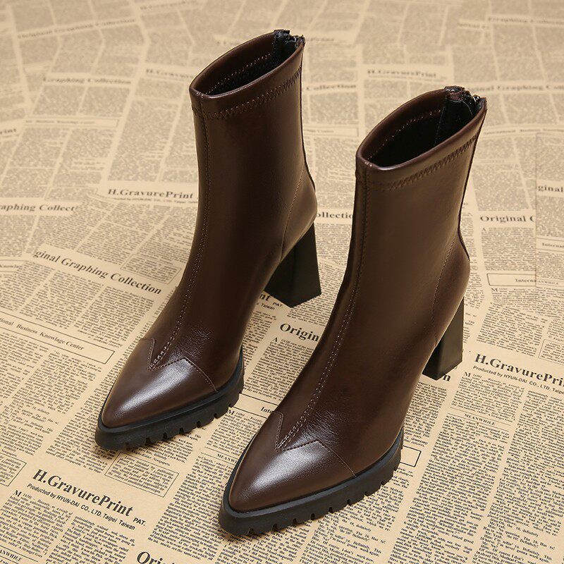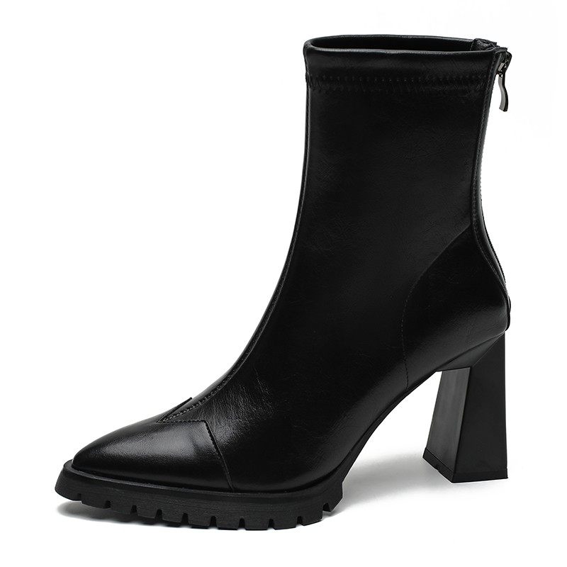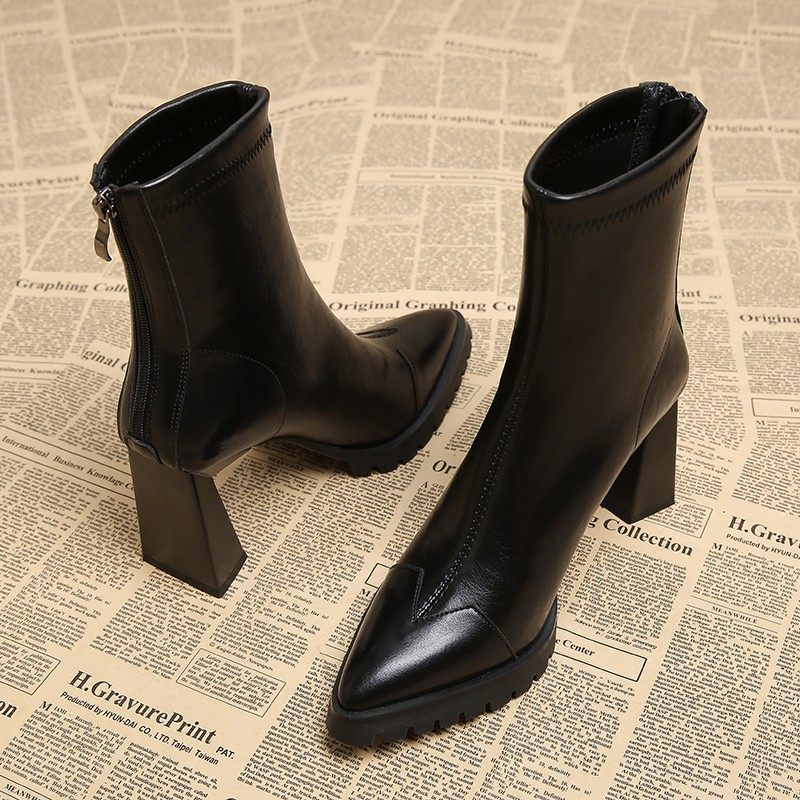 【跟高6cm】复古真皮瘦瘦靴方头显瘦秋冬新款高跟短靴粗跟弹力靴