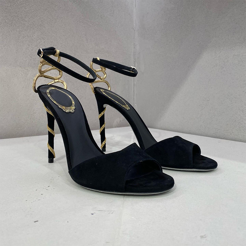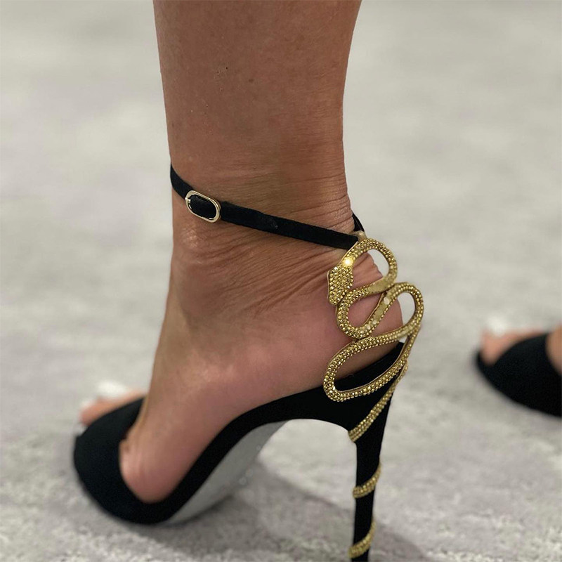 淘宝蛇形缠绕水钻细高跟鞋女23春夏新款黑色性感百搭一字扣带露趾凉鞋