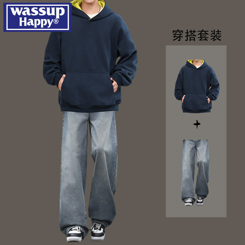 淘宝wassup happy美式复古连帽卫衣套装男士春秋季牛仔裤帅气搭配一套
