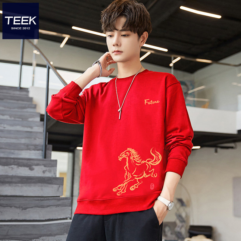 天猫TEEK酒红色男装卫衣加绒 2026新款马年本命年红色长袖T恤新年衣服
