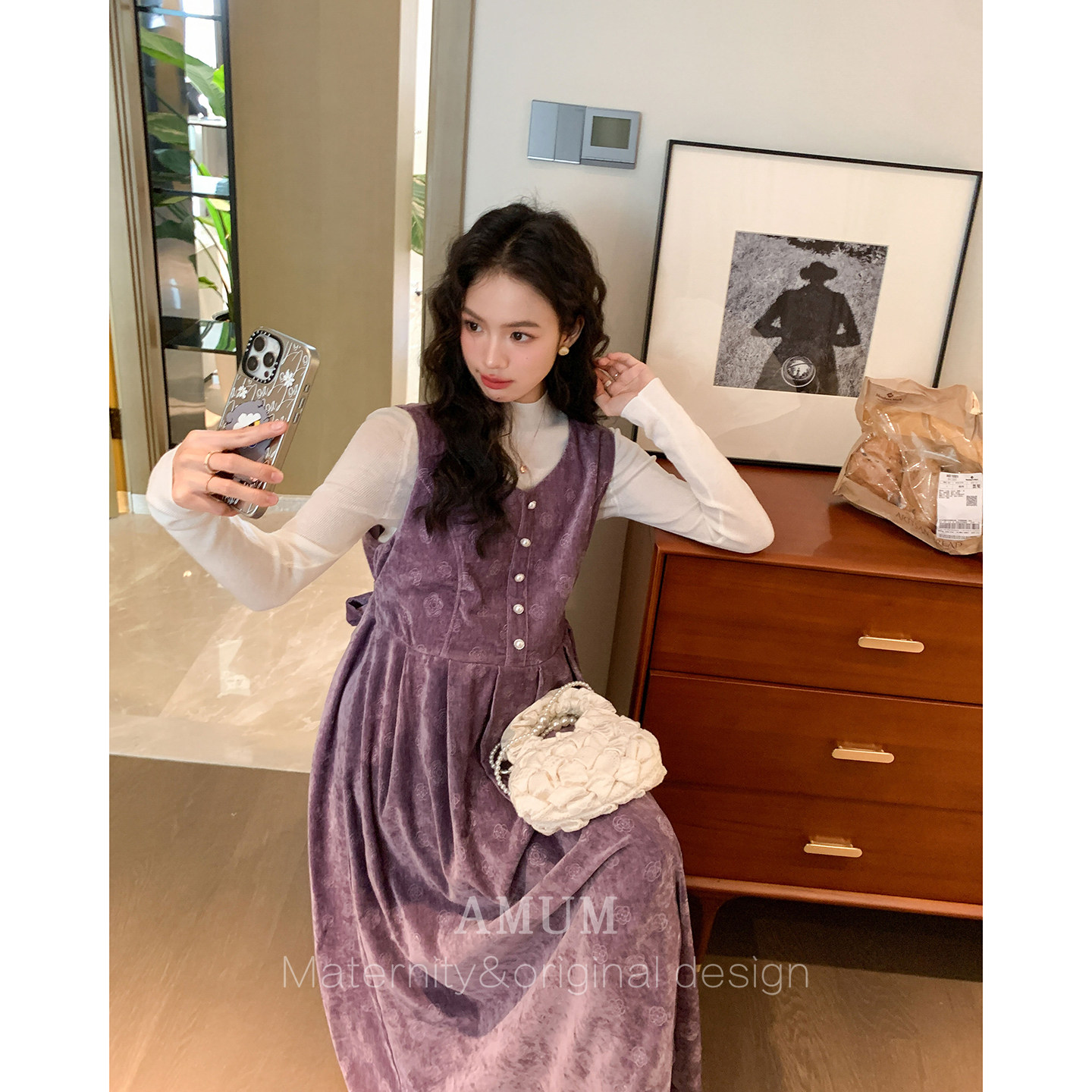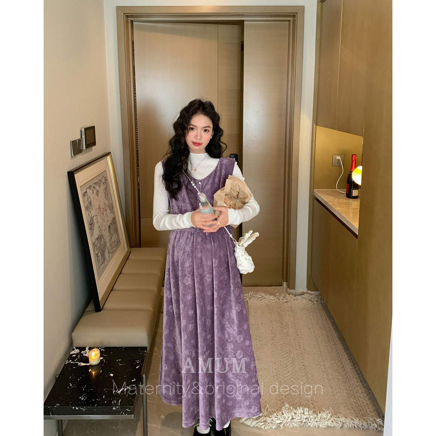 淘宝◆AMUM孕妇装◆韩系可露丽~复古丝绒背心裙秋冬叠穿气质印花长裙