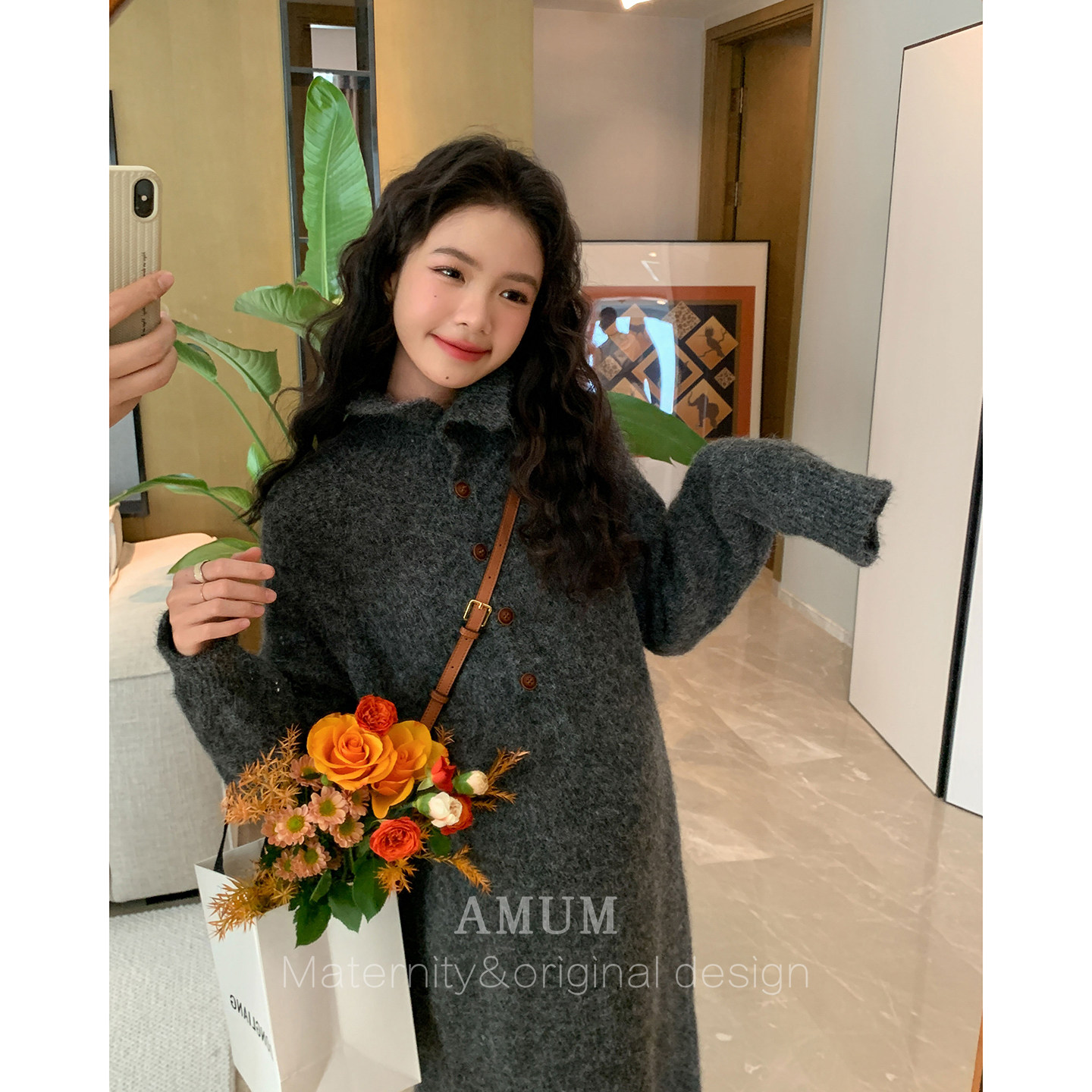 ◆AMUM孕妇装◆初代极简~慵懒多扣翻领宽松甜美糯糯针织连衣裙
