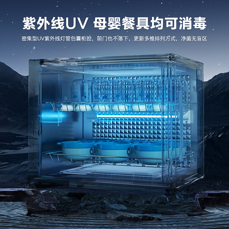 华帝小型家用迷你台式消毒柜,专为现代家庭设计,集紫外线消毒与烘干功能于一体,安全高效。采用UVC紫外线杀菌技术,深度灭活细菌病毒,守护家人健康。内置PTC热风循环烘干系统,快速去除水分,防止二次污染。小巧台式设计,节省空间,可轻松放置于厨房台面或婴儿房。适用于奶瓶、餐具、碗筷、水杯等日常用品消毒,尤其适合有婴幼儿的家庭使用。操作简便,一键启动,多重安全防护,使用更安心。华帝消毒柜,以专业品质为爱护航,让每一次用餐都洁净放心。