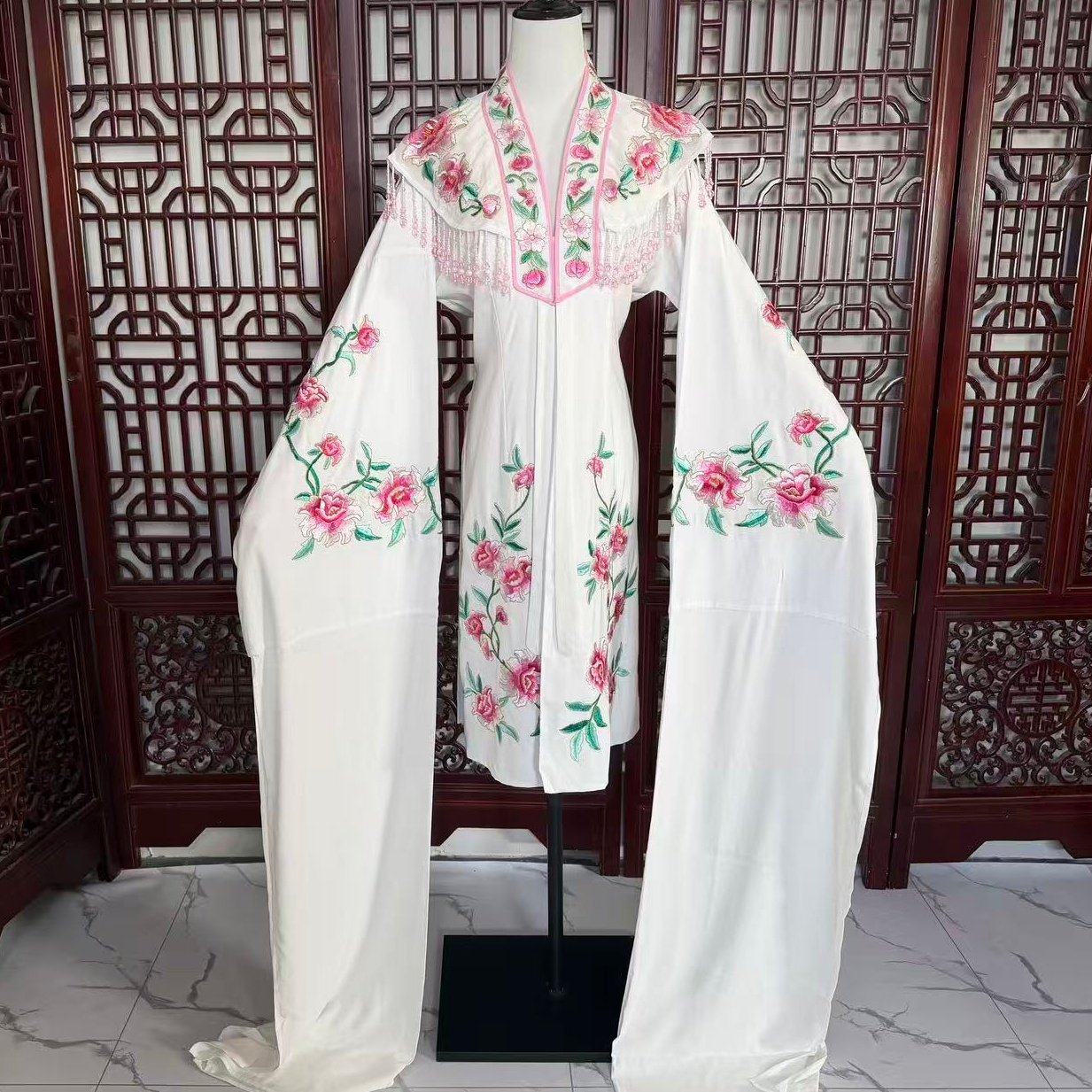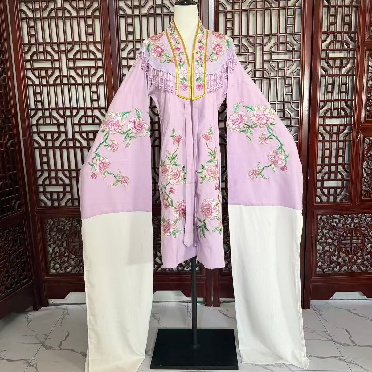 越剧戏服以典雅柔美著称,尤以花旦、青衣行当服饰最为精致。花旦戏服色彩明丽,多采用刺绣、镶边工艺,突出少女活泼灵动的气质;青衣服饰则端庄素雅,常见水袖、褶子,体现大家闺秀的温婉。黄梅戏小旦服饰风格相近,但更显质朴清新。其中“披”为常见外穿服饰,如“女对披”常用于《碧玉簪》中严兰贞一角,搭配珠翠头面与云肩,展现人物高贵身份与内心情感。整体造型融合江南水乡韵味,通过服饰细节传递角色性格与剧情张力,是传统戏曲美学的重要体现。