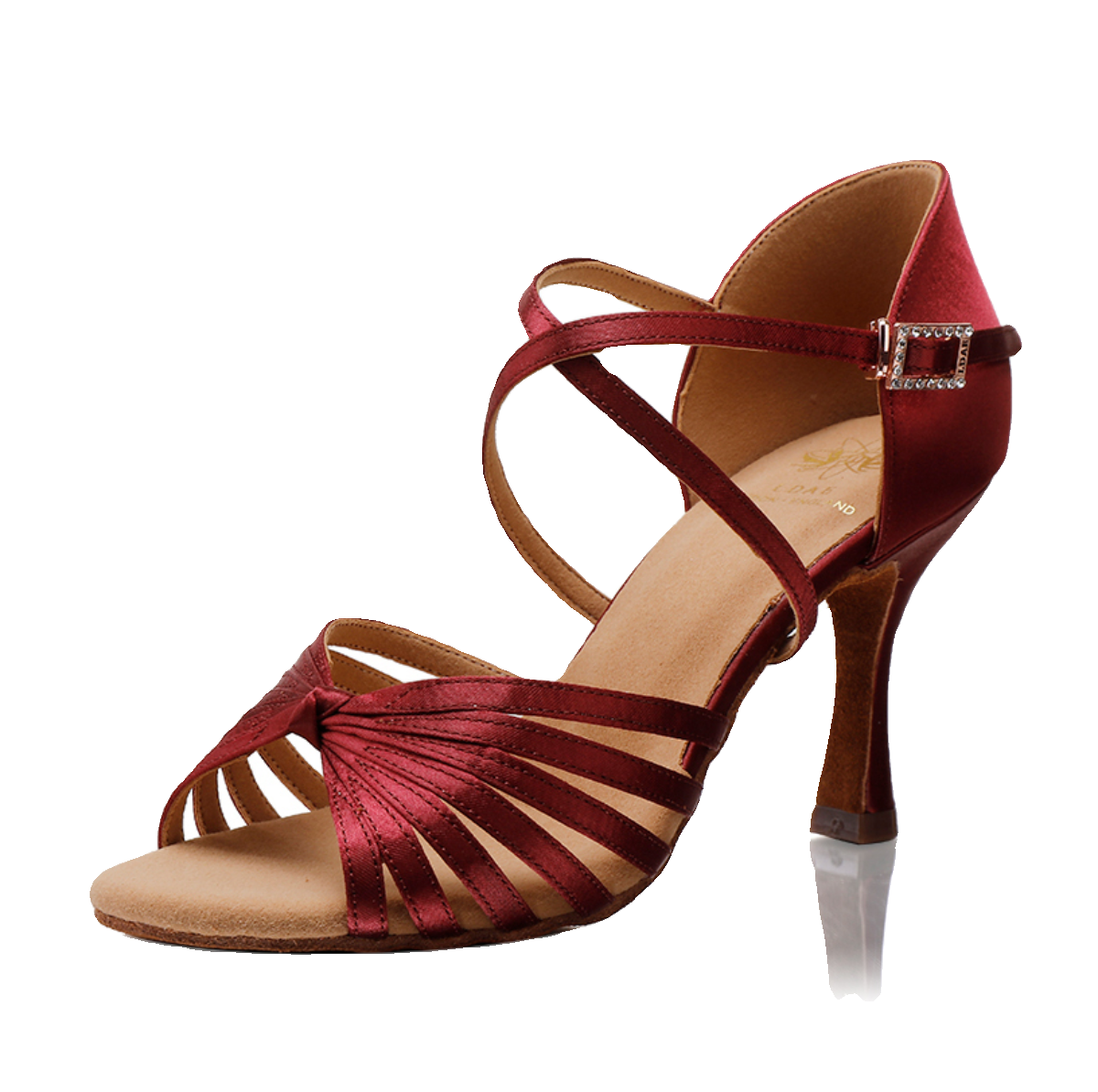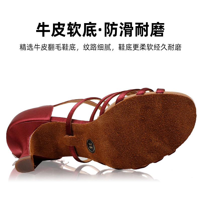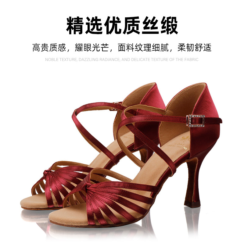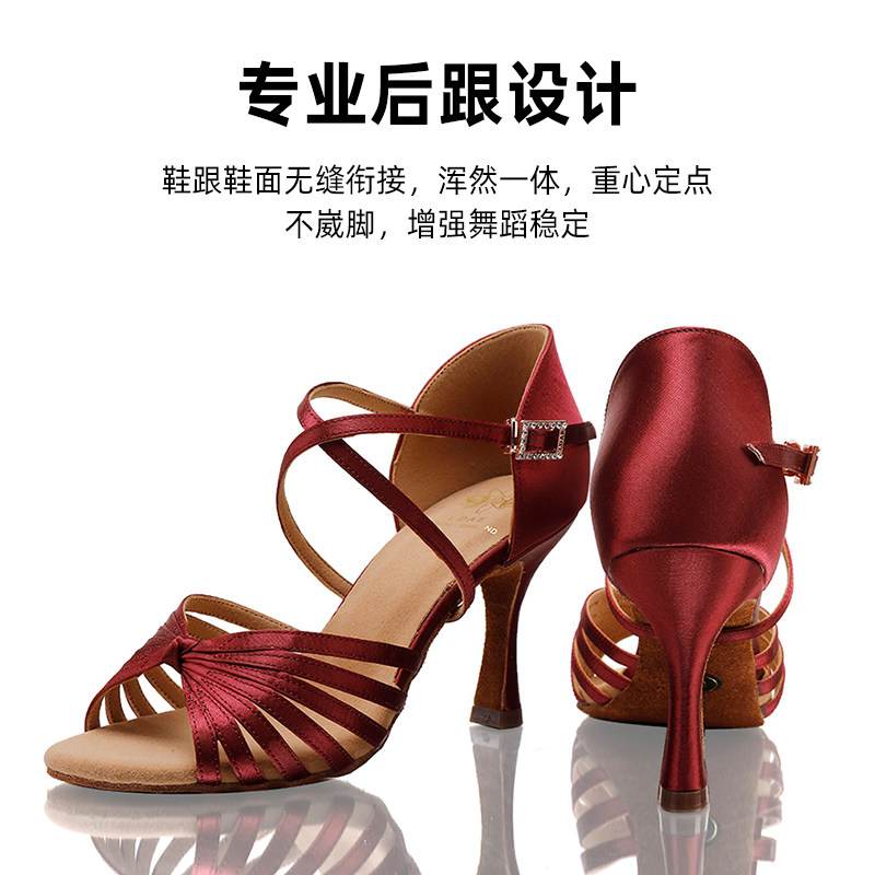淘宝LDAE拉丁舞鞋酒红色缎面女成人专业比赛练功跳舞鞋中高跟软底舞鞋