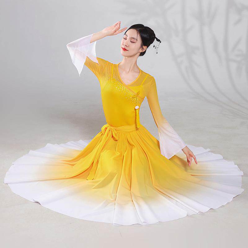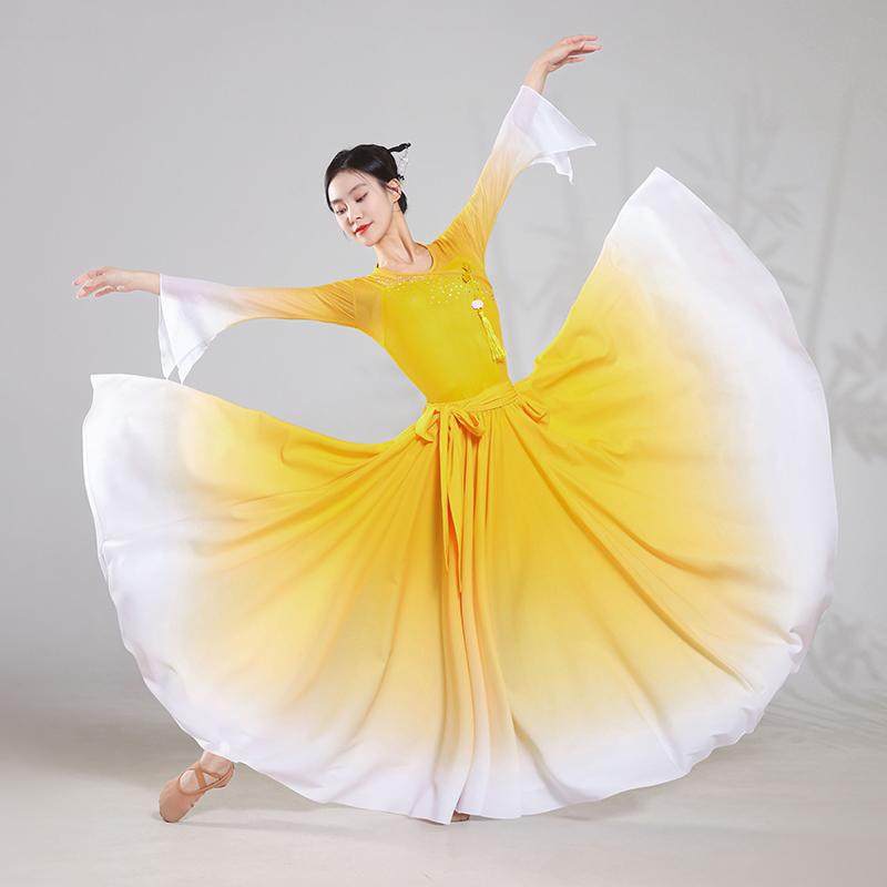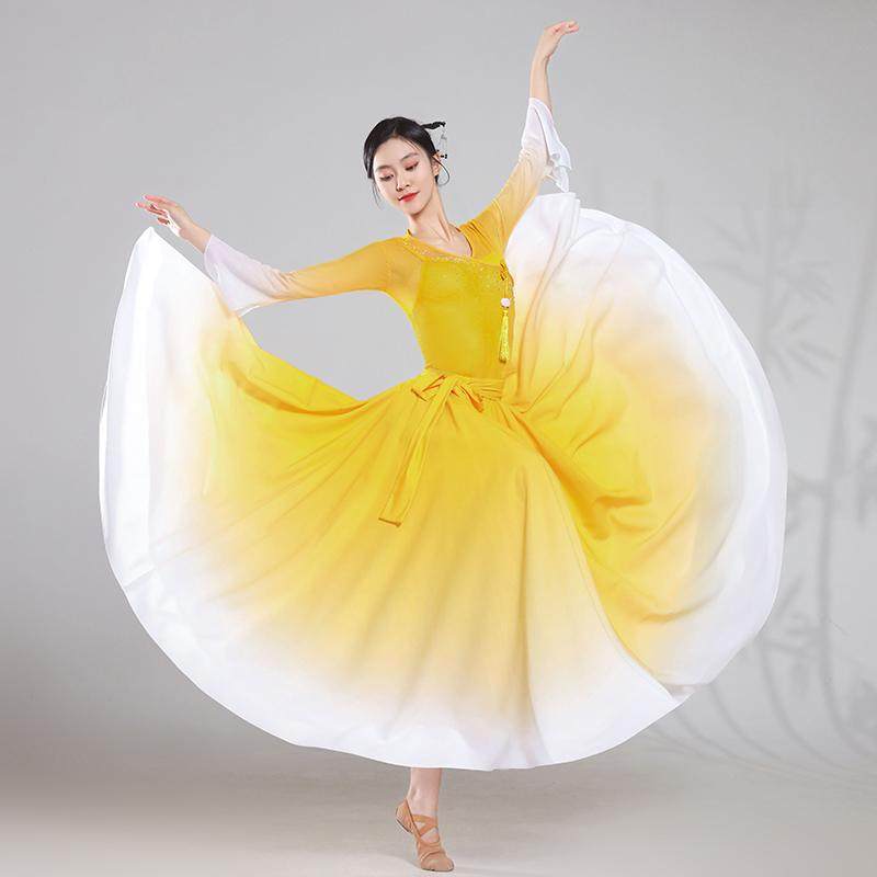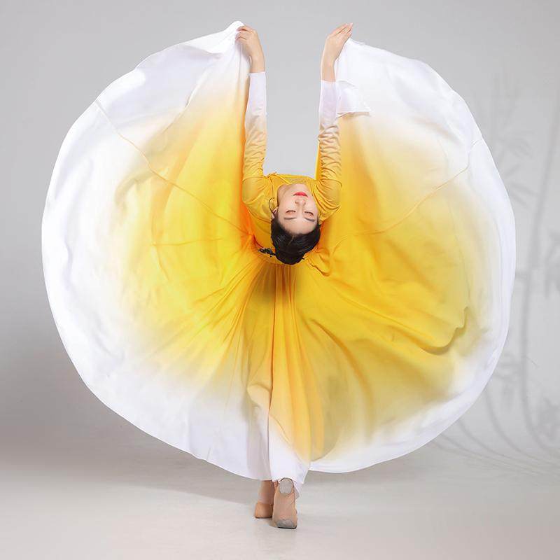 淘宝新款舞蹈服女渐变仙气V领黄白色飘逸渐变雪纺720度大摆裙服装套装