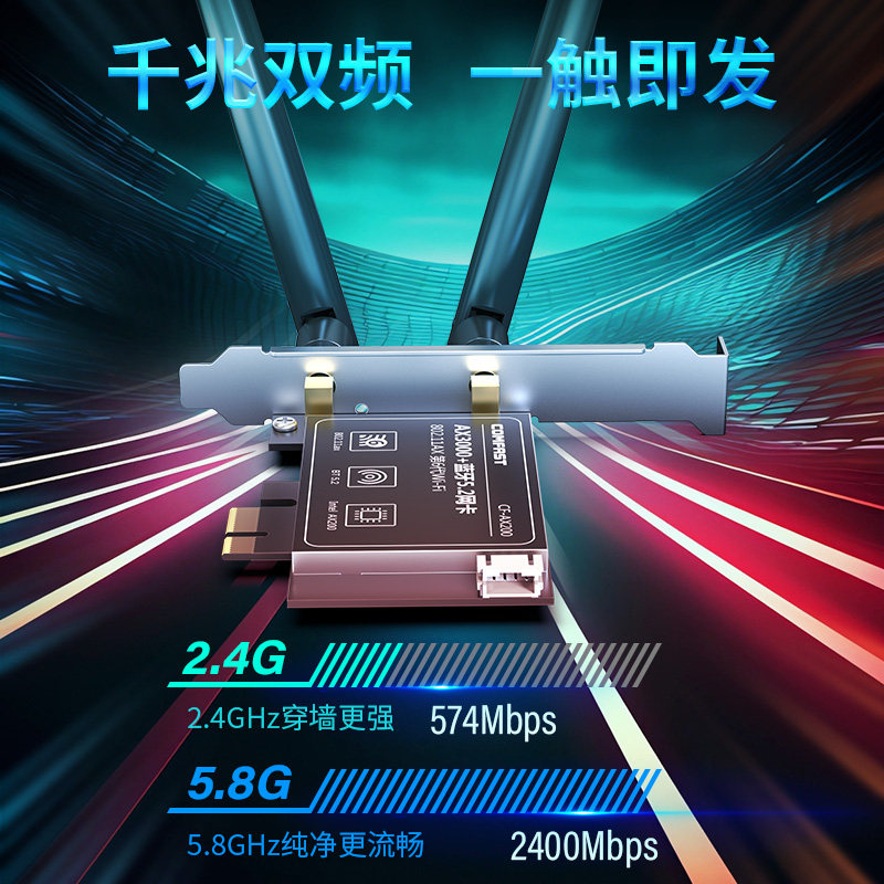COMFAST AX200/AX210是一款专为台式机设计的高性能内置PCIe无线网卡,支持Wi-Fi 6(802.11ax)标准,提供双频(2.4GHz/5GHz)千兆无线传输,理论速率高达2400Mbps,显著降低延迟,提升网络稳定性,特别适合电竞游戏、高清视频和大型文件传输。该模块集成蓝牙5.2功能,支持多设备稳定连接。采用M.2接口设计,兼容主流DIY主板,安装简便,信号接收能力强,配备高增益天线接口,增强覆盖范围。无论是升级老旧主机还是打造高性能游戏PC,COMFAST AX200/AX210都能带来流畅、低延迟的无线体验,是追求高效网络连接的优选方案。