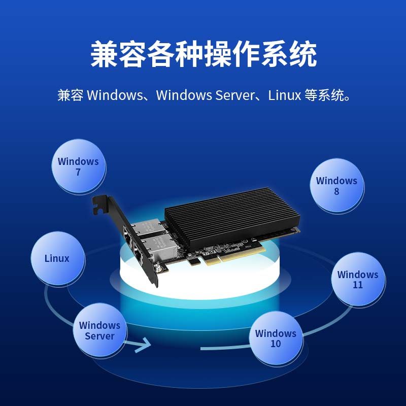 希力威视万兆双电口网卡是一款高性能网络适配器,采用英特尔X540与82599主控芯片,支持PCI-E接口,兼容台式机、服务器及群晖NAS等设备。该网卡提供双万兆电口(RJ45)及单光口设计,支持电口与光口自适应切换,满足不同网络环境需求。具备出色的数据传输能力与低延迟特性,专为电竞、高清流媒体、数据中心及高速文件传输优化。支持多种操作系统,即插即用,安装简便。凭借稳定的性能和广泛的兼容性,广泛应用于高性能计算、虚拟化平台及企业级存储网络,是提升网络带宽与响应速度的理想选择。