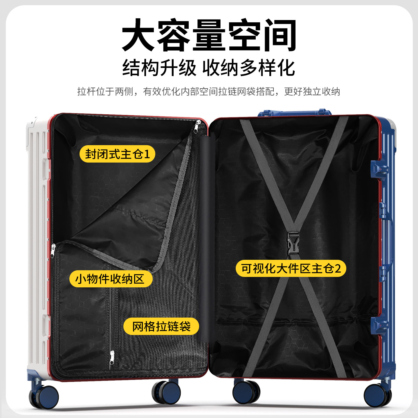2025新款20寸小型可登机子母箱拉杆箱,专为时尚女性打造,集实用与美观于一体。采用高强度铝合金框架,坚固耐用,抗摔抗压,搭配加厚PC材质箱体,轻盈且防刮耐磨。创新子母箱设计,主箱可独立使用,子箱灵活收纳小件物品,提升出行效率。配备TSA海关密码锁,安全便捷,全球通关无忧。360°静音万向轮顺滑静音,双排八轮设计稳定承重。内部科学分区,收纳井然有序。符合国际登机尺寸标准,轻松应对短途旅行与商务出行,是现代女性出行的理想伴侣。