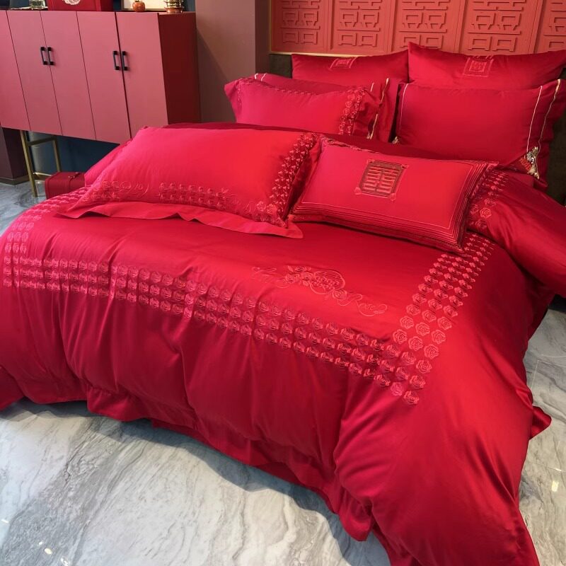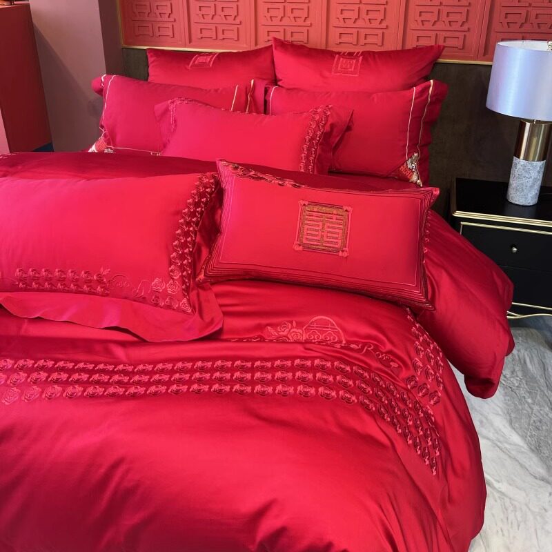 新中式婚庆床上四件套全棉100支长绒棉印花刺绣红色结婚被套床单