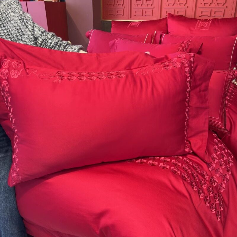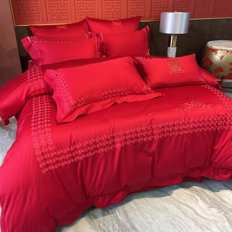 高档婚庆四件套100S长绒棉磨毛被套红色纯棉全棉床单结婚床上用品