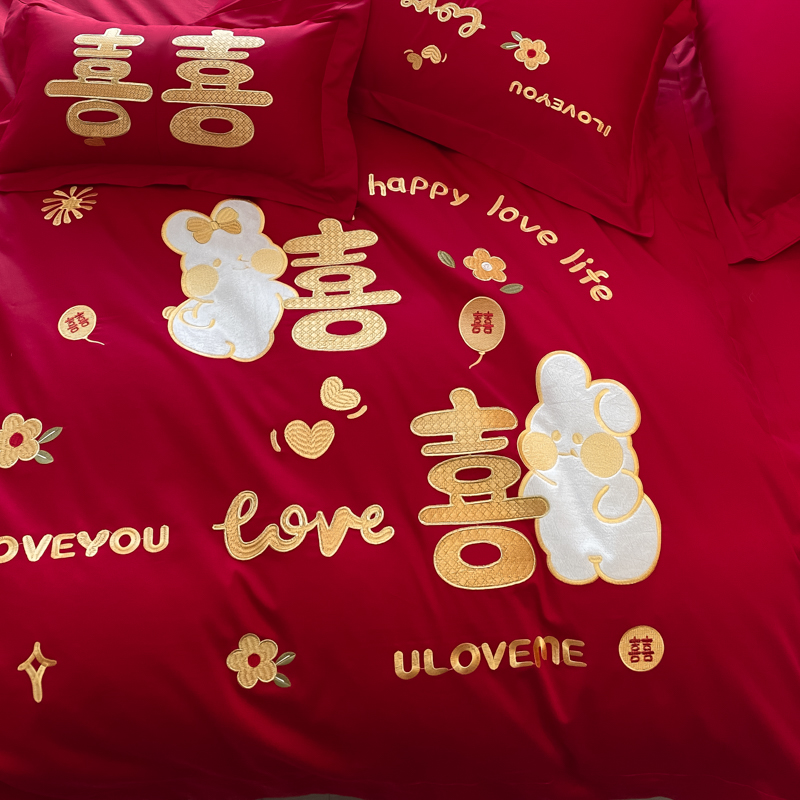 淘结婚纯棉四件套新婚喜庆大红色刺绣婚嫁陪嫁全棉被套床单床上用品