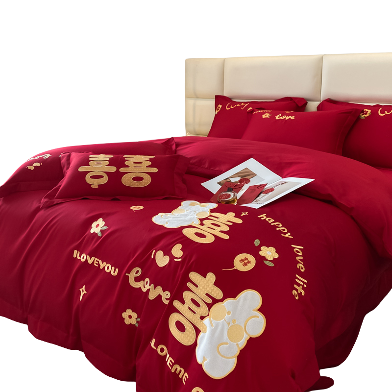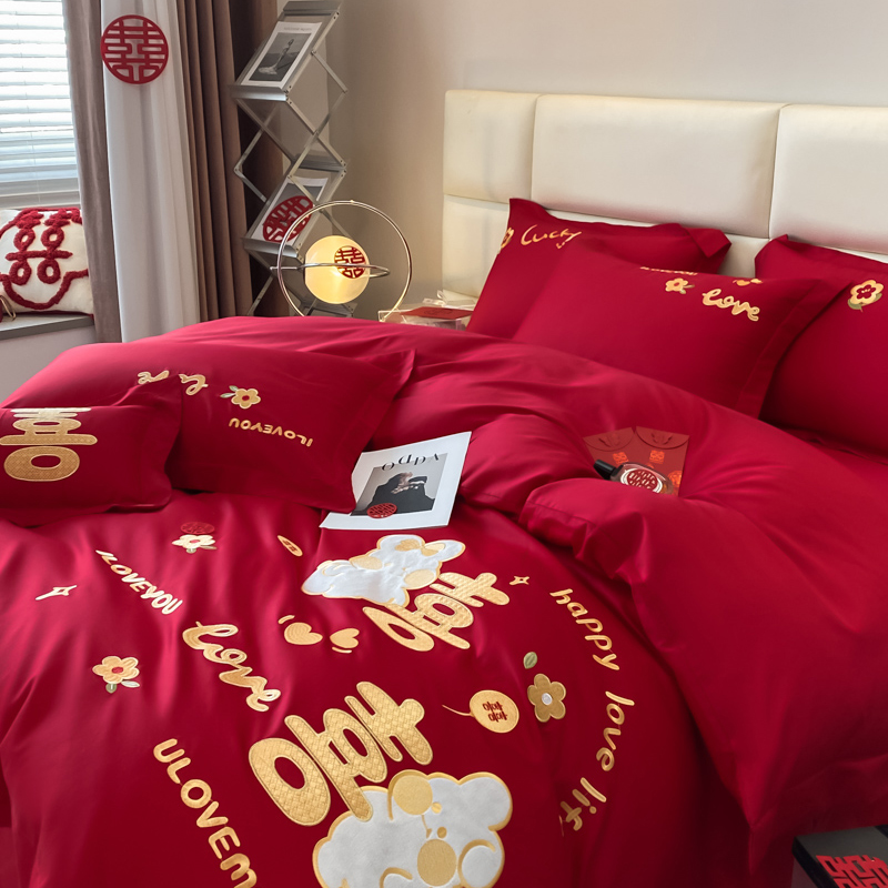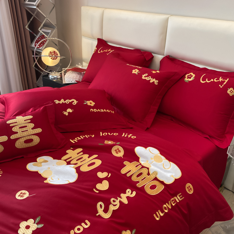 淘高档简约婚庆四件套大红刺绣全棉喜被罩新结婚房100纯棉床上用品4