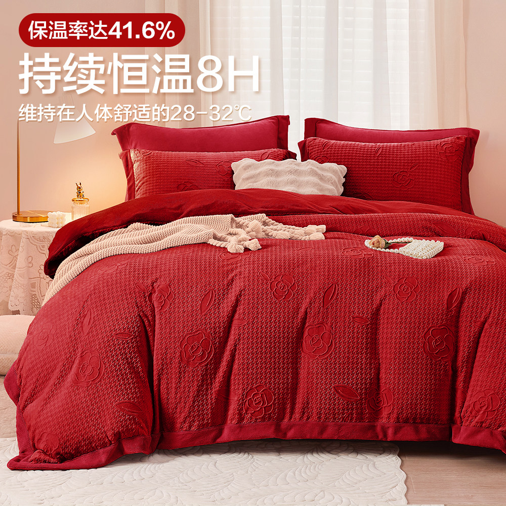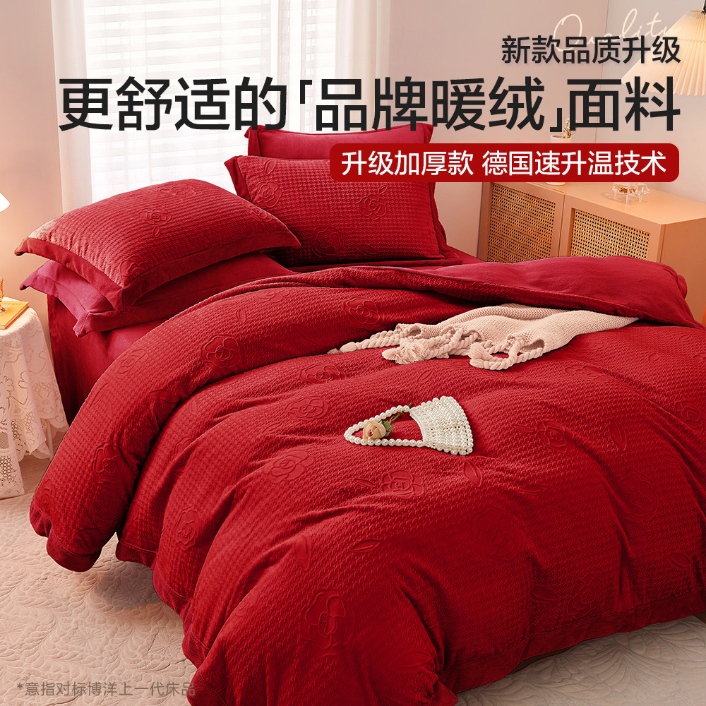 淘红色结婚用牛奶绒四件套轻奢高级感冬天加厚珊瑚绒被套法兰绒床品