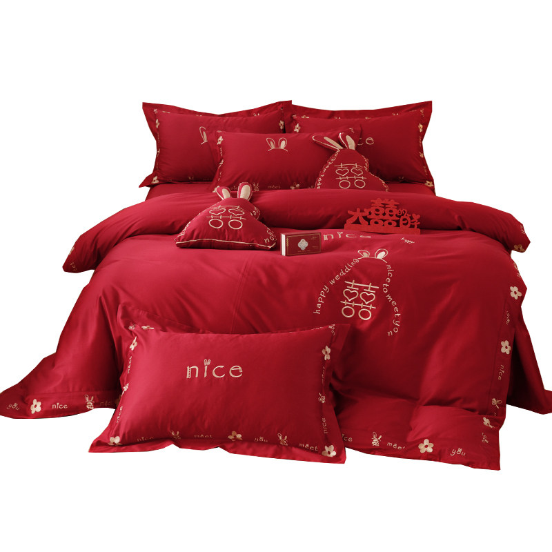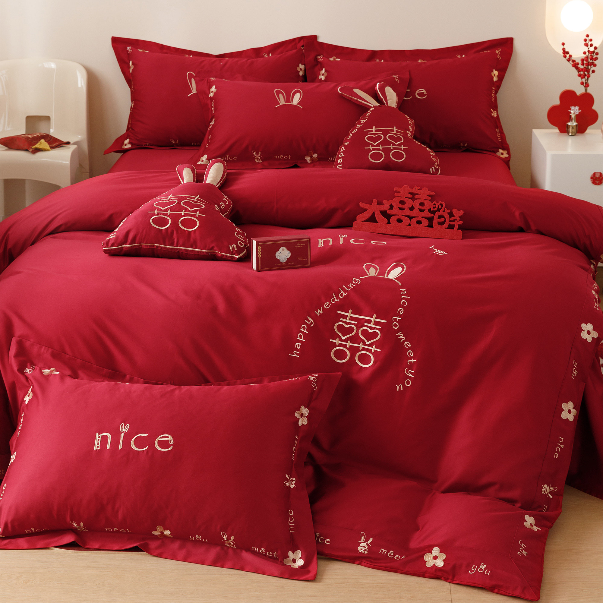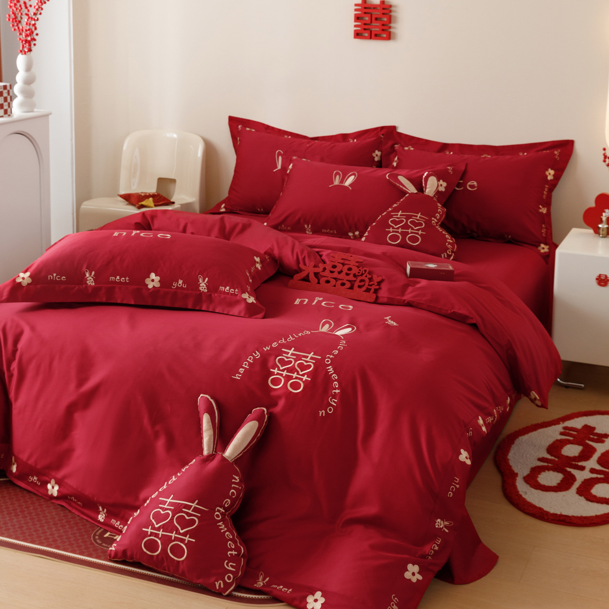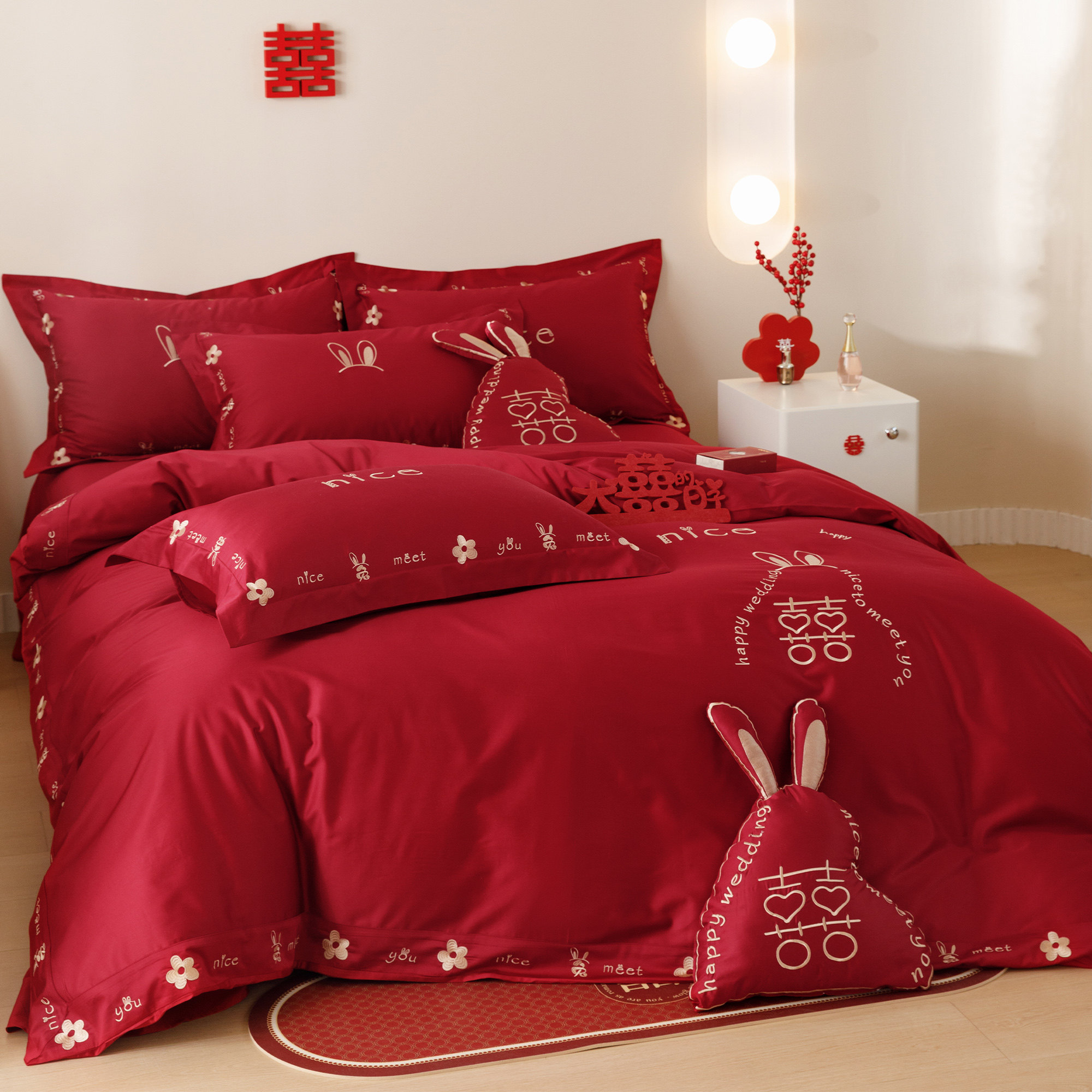 淘宝简约新婚庆床品四件套全棉100s兔子刺绣红色结婚被套双人床单床笠