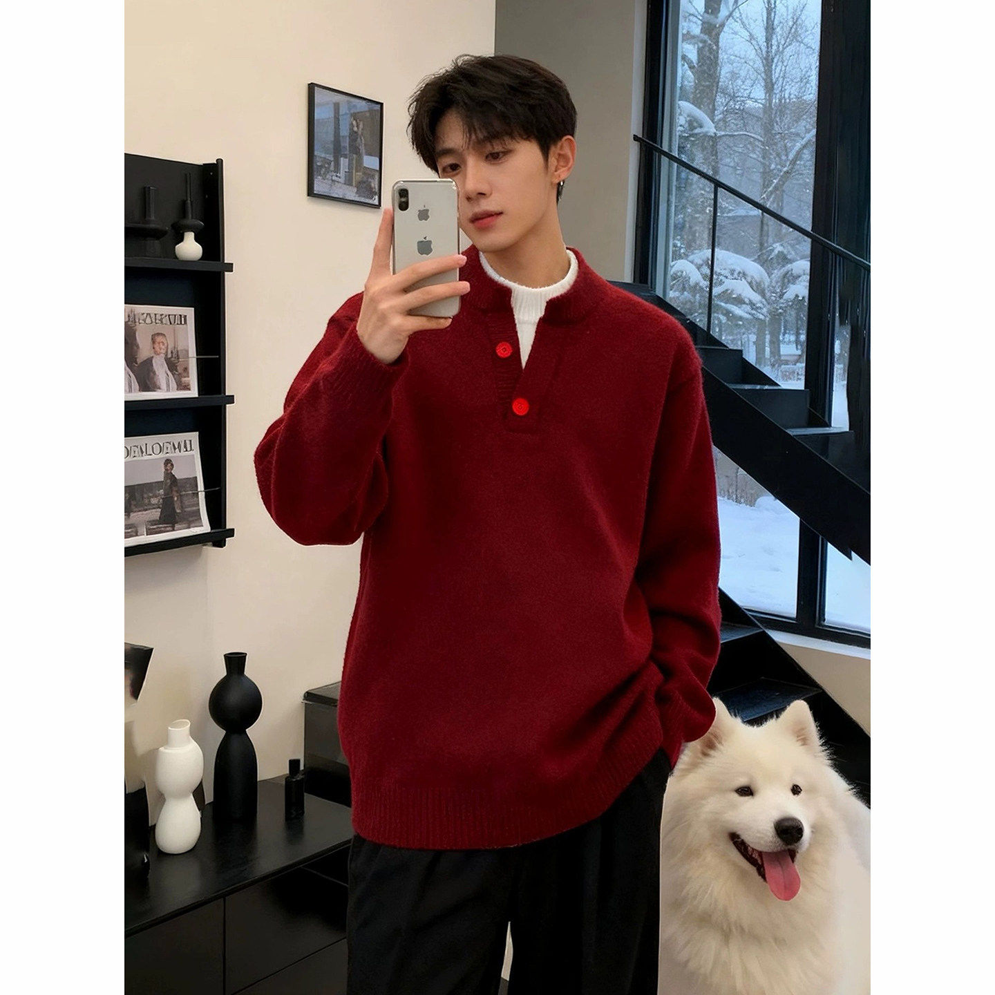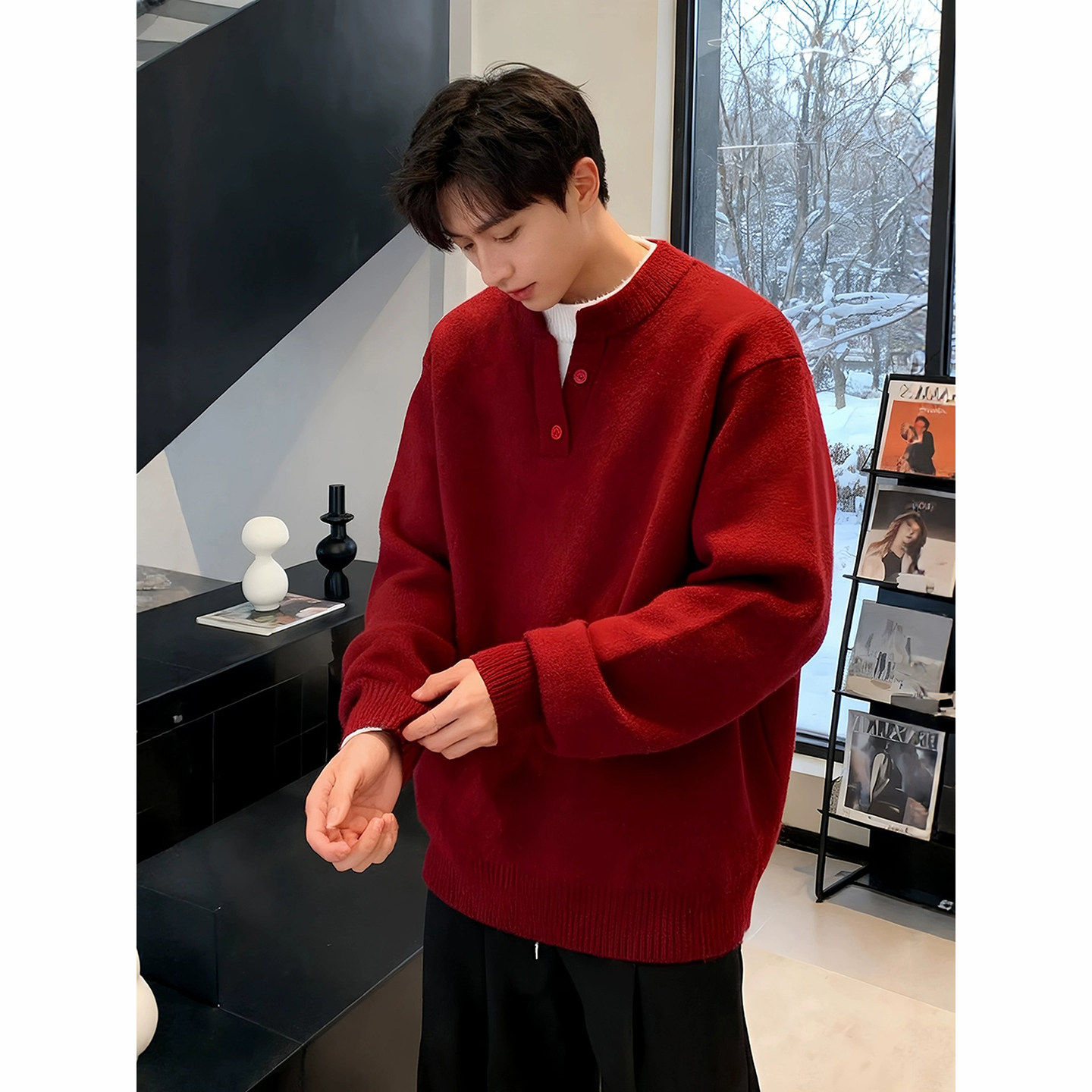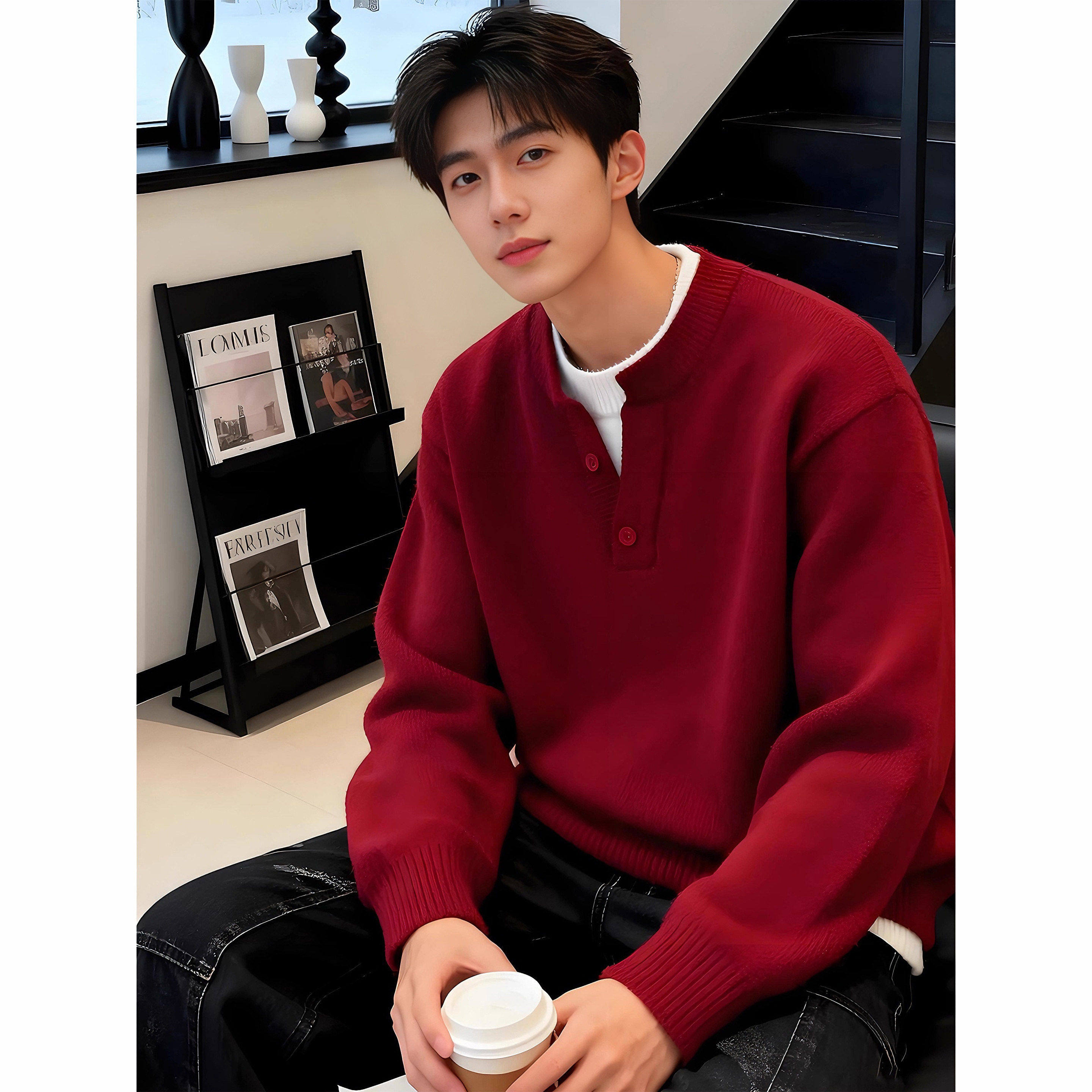 天猫假两件亨利领polo毛衣男款冬季圣诞穿搭红色针织衫情侣内搭打底衫