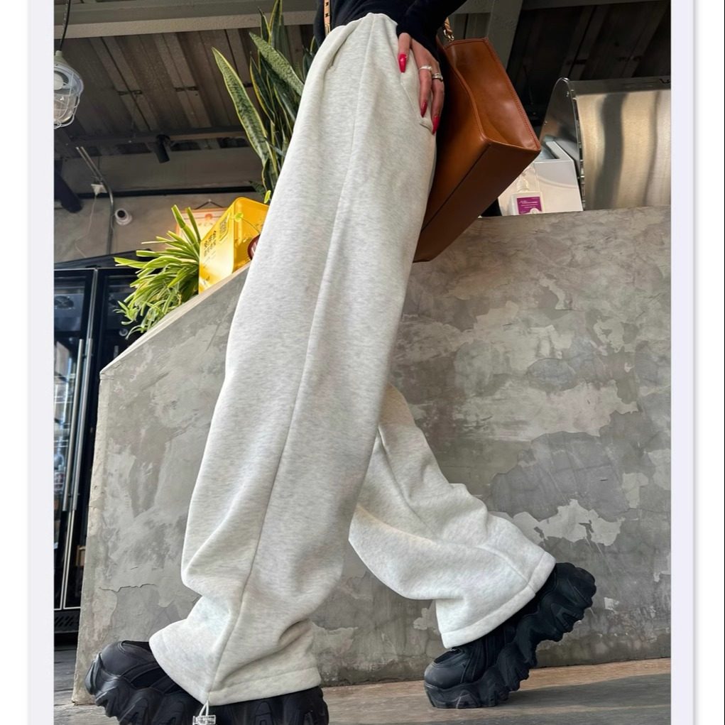 淘黑色窄款阔腿裤女秋冬加绒加厚大码显瘦直筒裤宽松休闲学生运动裤