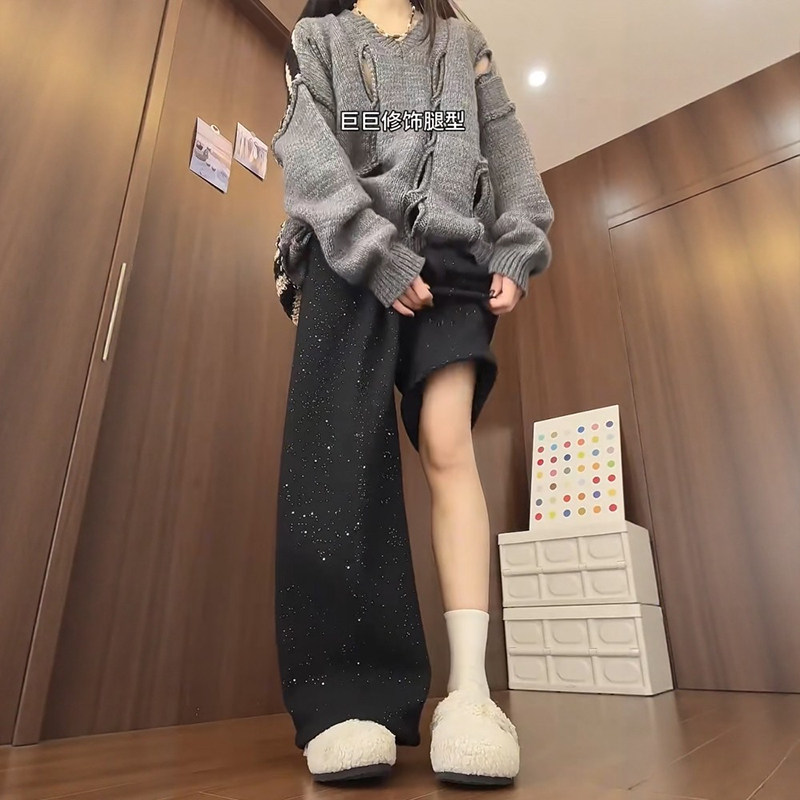 淘黑色窄款阔腿裤女秋冬加绒加厚大码显瘦直筒裤宽松休闲学生运动裤