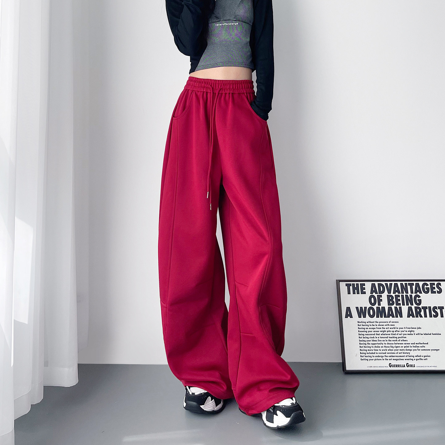天猫美式高腰抽绳运动裤女2025冬季新款大码胖mm显瘦加绒阔腿红色卫裤