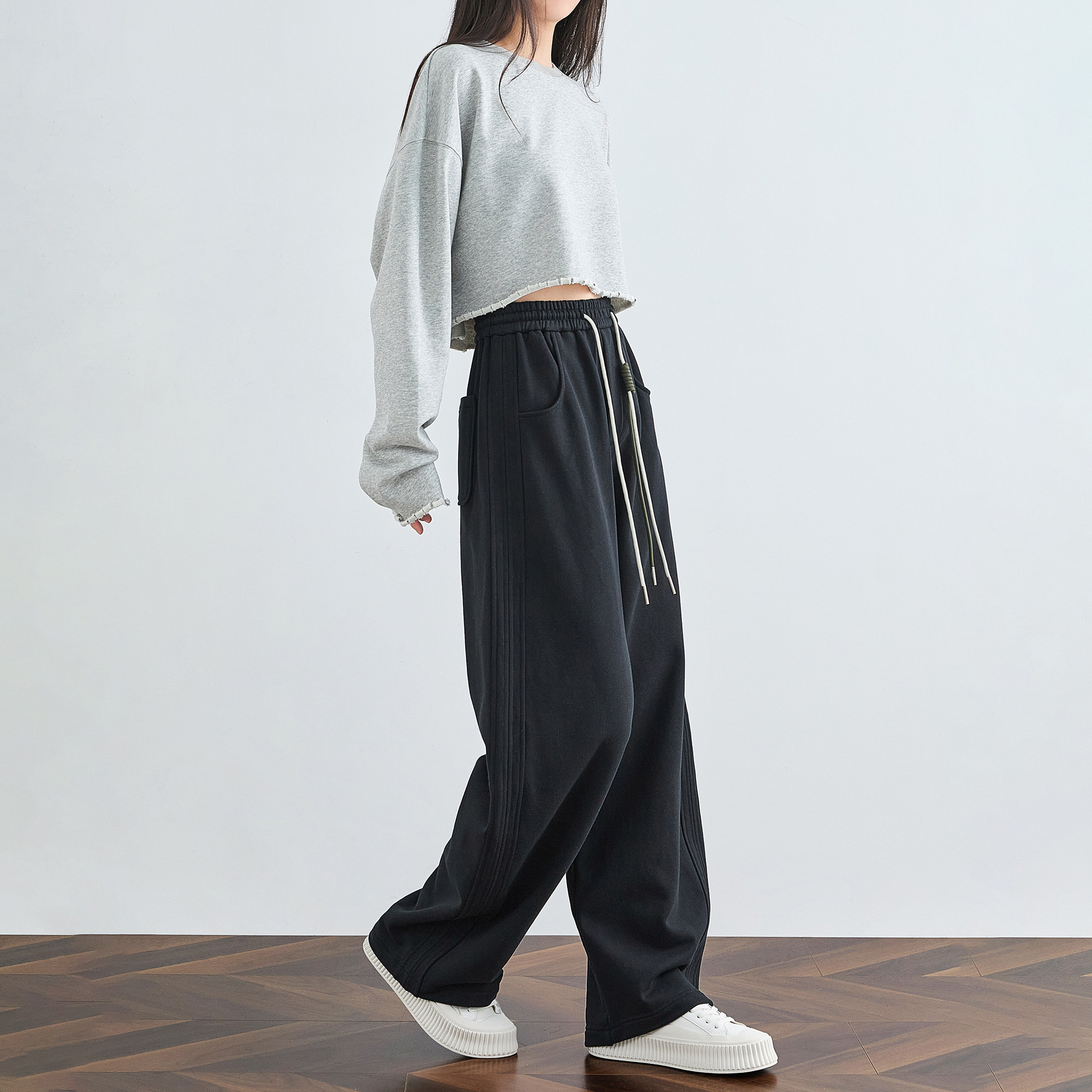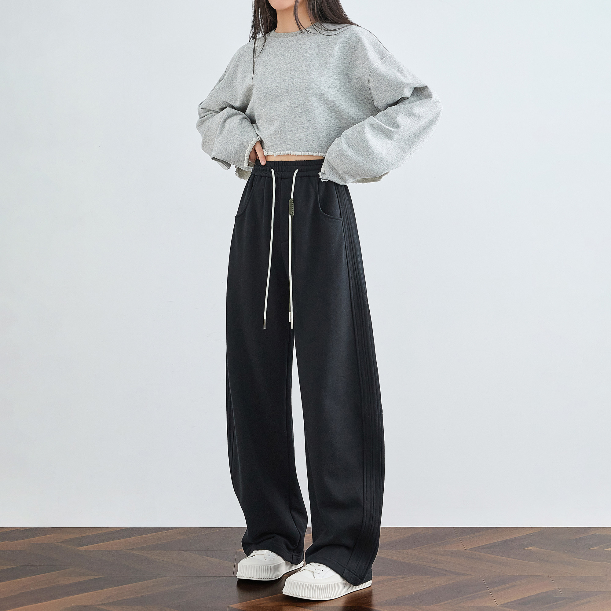 淘美式高街条纹字母阔腿运动休闲裤秋冬宽松直简日常穿搭慵懒卫裤女
