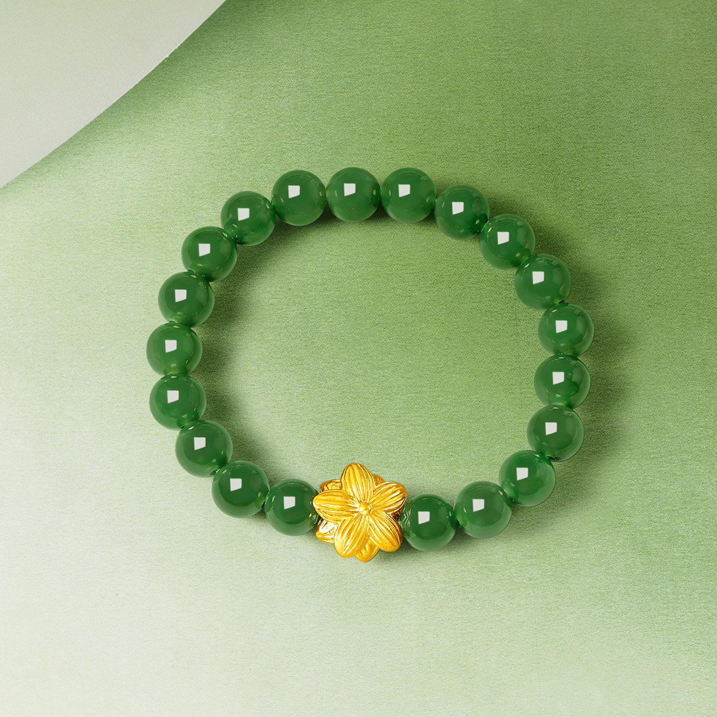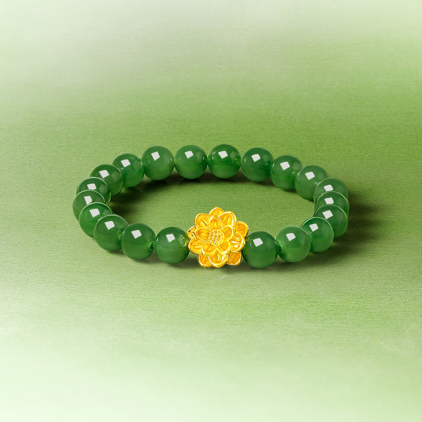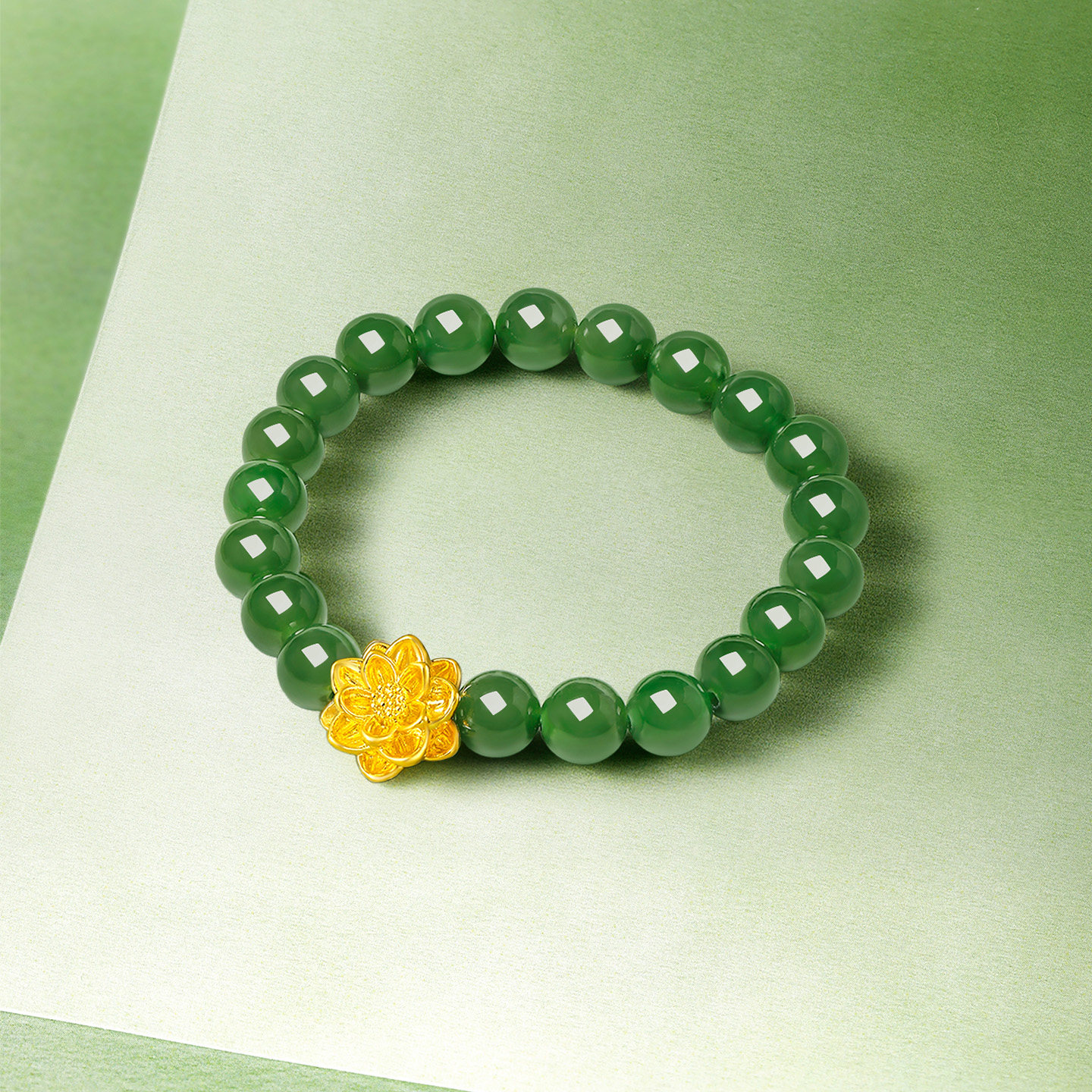 天猫周六福珠宝黄金金镶玉手链和田碧玉莲花手串手饰送女友新年礼物